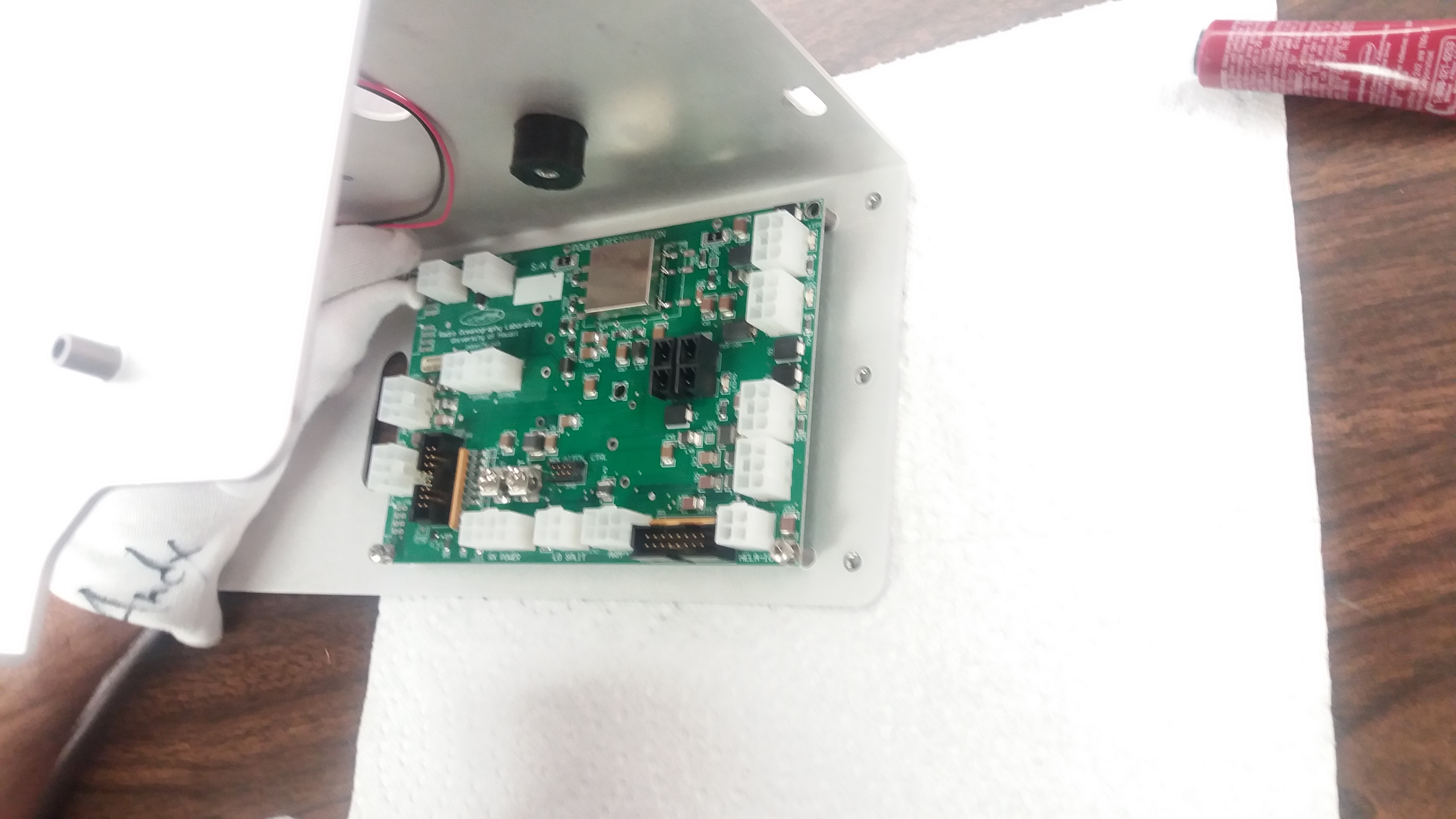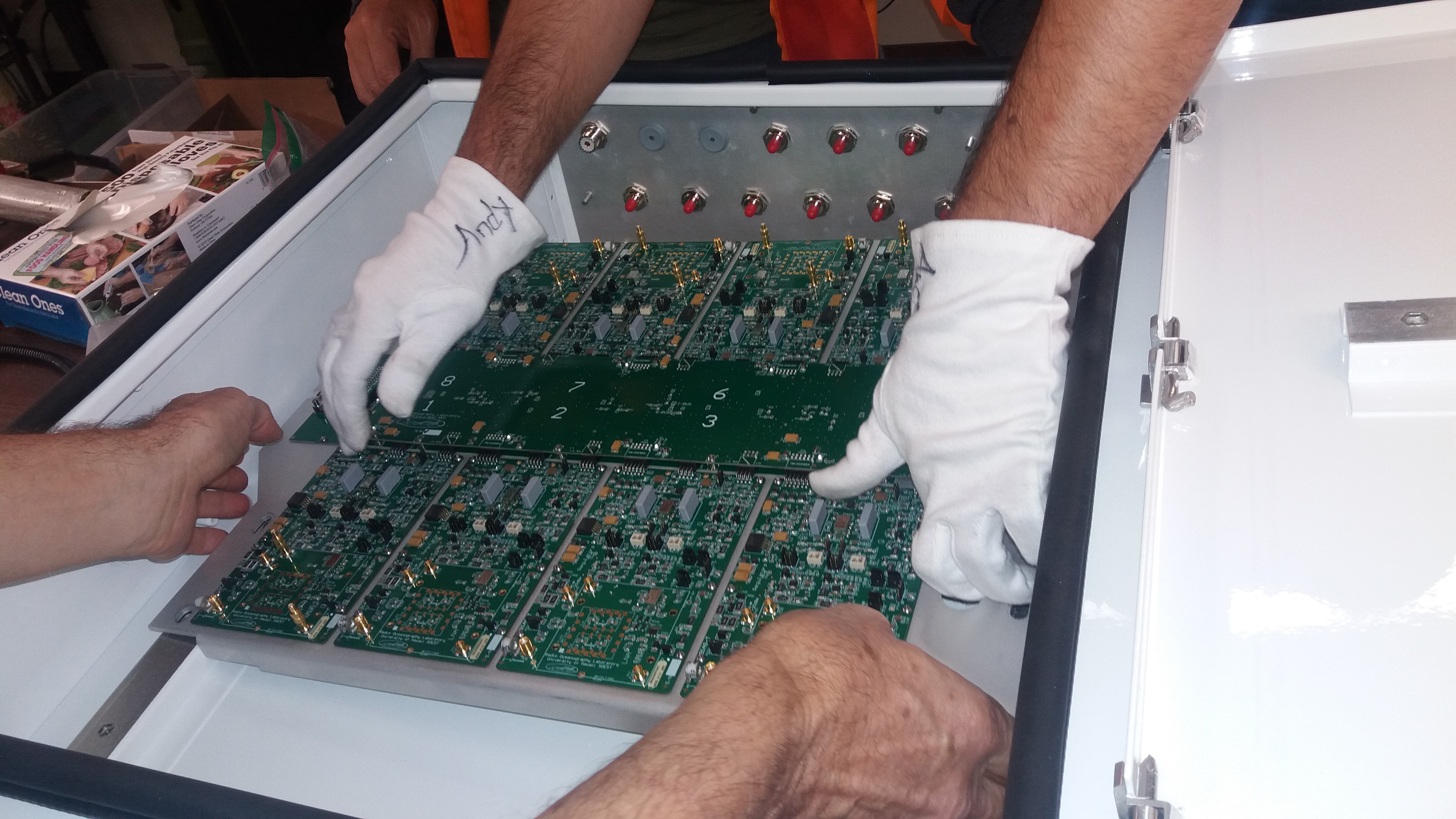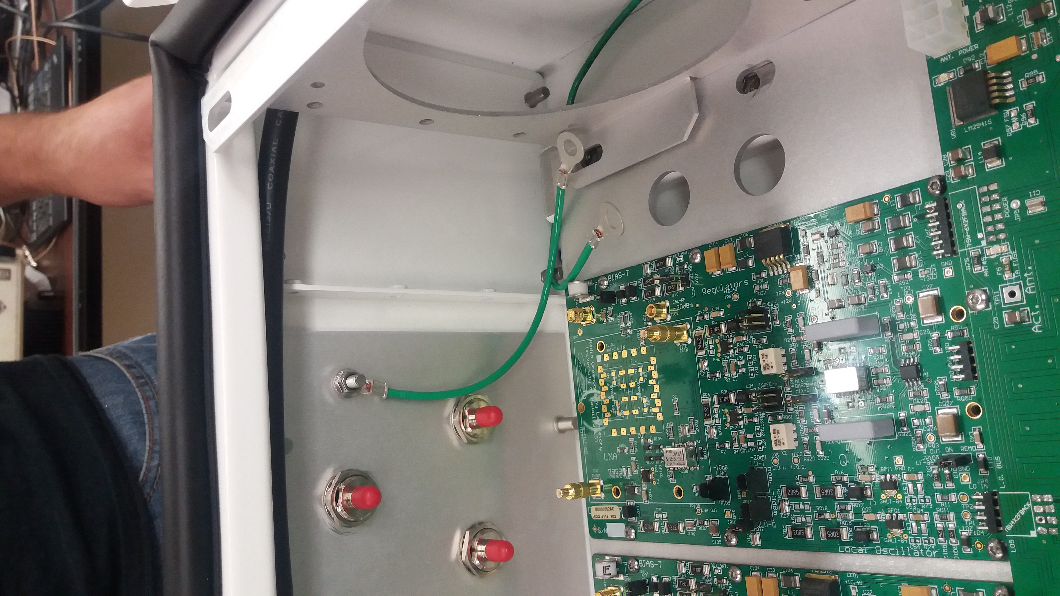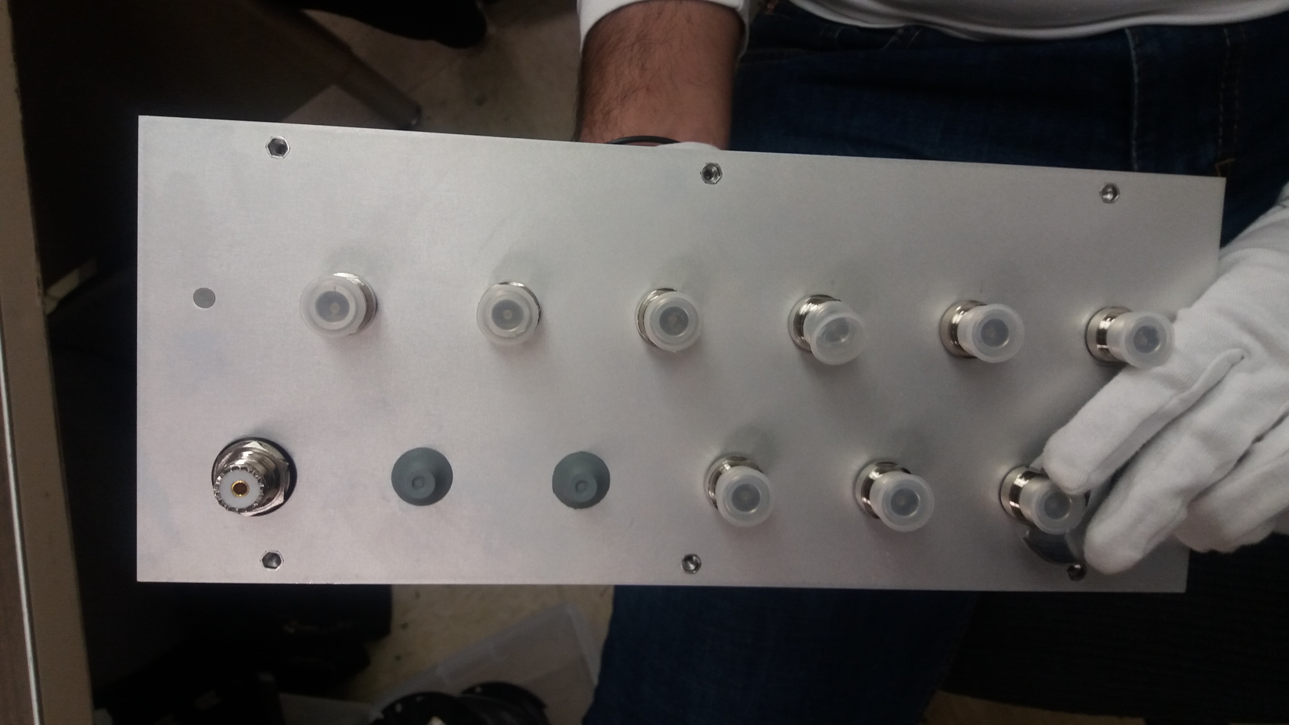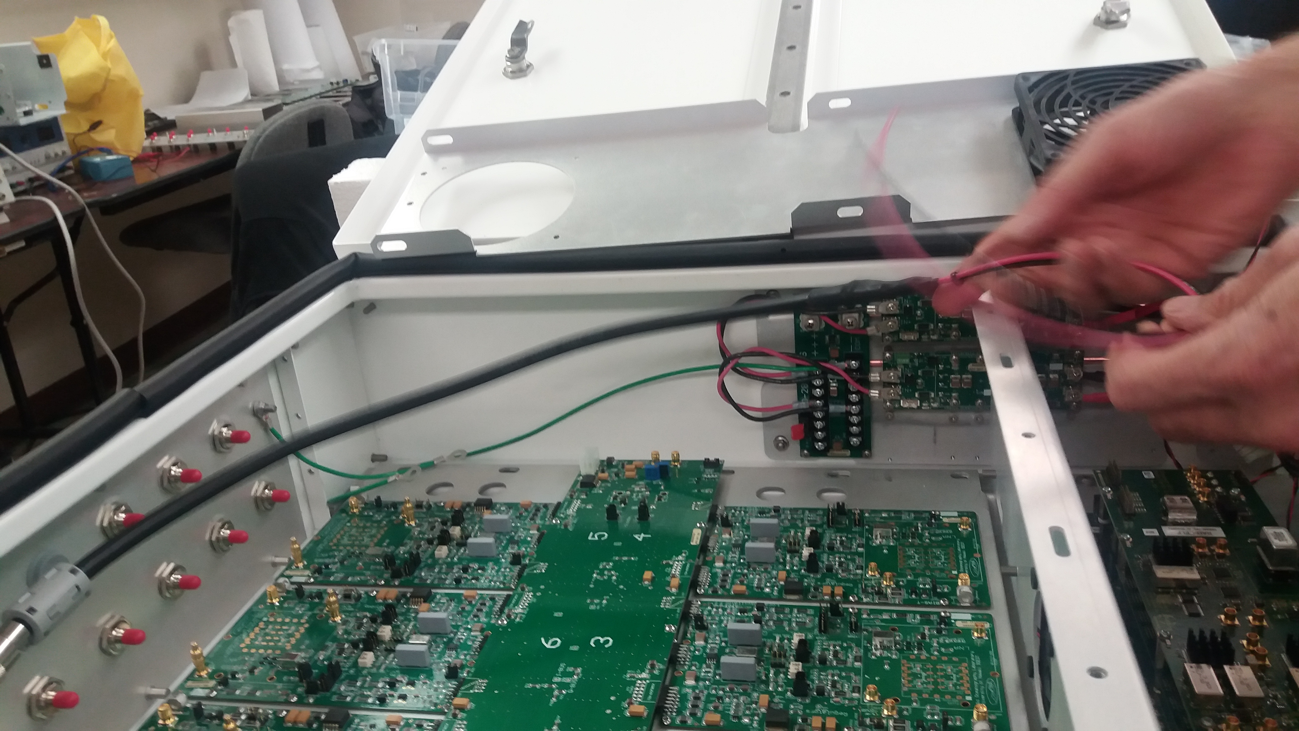 The plates are assembled on which the 8 crx cards will be placed. (Be careful with these plates because they can break if force is applied at certain points). The plates are going to be joined with 4 screws in the center and a glue (network) is applied so that they do not come loose (this will be placed at the end of the screw, the excess is removed). We must ensure that the two plates are even because above this anger the first plate with the antenna numbering (analog back plane) and it is important that they are even the bottom plates (preferably on a flat surface, it does not matter if the tabs are not at the same level, the important thing is that the top is at the same level. The first plate (analog black plane) is placed and on top of that the other plate is placed (LO back plane). To this plate we have to put the pins of the jumper, one is placed first and then others and on those the card will be soldered (circuit). The two plates are screwed to the base with 10 screws. Between the two plates are placed black spacers a single washer so that the connectors to the upper and lower plates are aligned. After installation, but thread lock onto the screws from underneath. Before putting the plate to the aluminum structure, you must check the length of the screws, so that they are not touching the bottom of the structure. At the end of the screw the glue (blue) is applied and excesses are cleaned. Note = the screws on the edge of the plate are shorter. Connect coaxial cables Before connecting the coaxial cables of the crx-8 plates to the antenna connectors, the liquid should be applied to clean connectors (contac lubricam) in order to avoid corroding (it should be applied a little more, avoid excesses) . It should also be put on the connectors where you can get noise like the scsi and the jumper. Power distribution supplies To have the complete plates of the vicor board the first thing that was done was to solder a resistance to the circuit and later a vicor module (v28c15c100bl) was incorporated in the lower part and the pins were soldered in the circuit, it is important that the welding cover the pin center and pass through the center of the pin to the bottom of the plate. The output of the plate must be 12.5 volts. (note = if we use 8 channels we will use 2 of these board and if we have 4 channels we use 1). Also, screw the little screws on the green connectors all the way in so they do not fall off. These circuits are put in turn in another base that is installed in the large structure (box), at the base of the vicor module a glue is applied and it is spread all over the base of this before putting it in the base, it is to ensure that the entrance of the vicor board that is being installed is on the correct side where it is going to connect with the input terminal board, in the holes where the vicor board is to be screwed, blue glue is applied. To install it is placed at the base of the vicor module on the other base and the base is moved a little to spread the pagemento but only a little. In the lower part of the base is applied glue and in the heat had (barilla) also before inserting in the orifices (if two plates are used also two heat pipes are used, care must be taken to install the correct side tuvos of heat). In the lower part of the plate glue is spread trying to cover where are the heat tuvos and part of the plate, also draw a square where the plate will go in the structure and also add glue. (NOTE = it is important that when the whole plate is installed in the structure it does not have the input card terminal because with the screw of the structure it does not fit well, so first the plate is placed in the structure and blue glue is applied to it. screw and then the input terminal card will be installed). You must clean excess glue. And they are going to put additional screws because the glue was coming out to the top of the plate. After everything is installed on the board, two cables will be connected per board between the vicor board and the input terminal board (if it has 8 channels, there will be 2 vicor board so 4 cables will be connected between the vicor board and the input terminal card). The black wire will always go in the row above (-) and the red in the row below (+), can be connected in any of the screws does not matter, except for the first one that corresponds to the ground in the input terminal, on the vicor board in the same way it is corroborated that the black wire is in the screw that says (-) and the red in which it says (+). On the other hand, at the output of the vicor board another 11 "cable is connected (make sure that black is on (-) and red on (+)) that goes to the power distribution. if you have 2 vicor plate there will be two cables that go to the power distribution plate, but if you have only one vicor in the same way you need the two cables, only in the vicor the two cables will be connected in the same place but in the power distribution anger connected as if we had two vicor plate). Antenna adapters (connector plate) The type M power connector (VHF connector) was installed in the lower right (for this the size of the hole had to be enlarged to 7.2 mm (confirm measurement)). To place the connector it put a nut, a guacha and an O-ring on the bottom (out) and on the top (in) a guacha and a nut. Later in the holes of the upper part we installed connectors type SMA to type N and in 3 holes of the lower left row (nut, guacha, plate in the upper part). to adjust kegs use 19 mm and 18 mm keys, so they are aligned. Note = if only 4 channels are used, black plugs are placed on the channels that are not going to be used. In the other two holes a gray plastic pressure plug was placed (it is placed towards the lower part (out)), before placing them with the deburring, the hole was softened and silicon (Heavy Duty silicone) was applied to lubricate them. Before installing the plate in the structure (box) apply blue glue in the screw holes (so that it doe