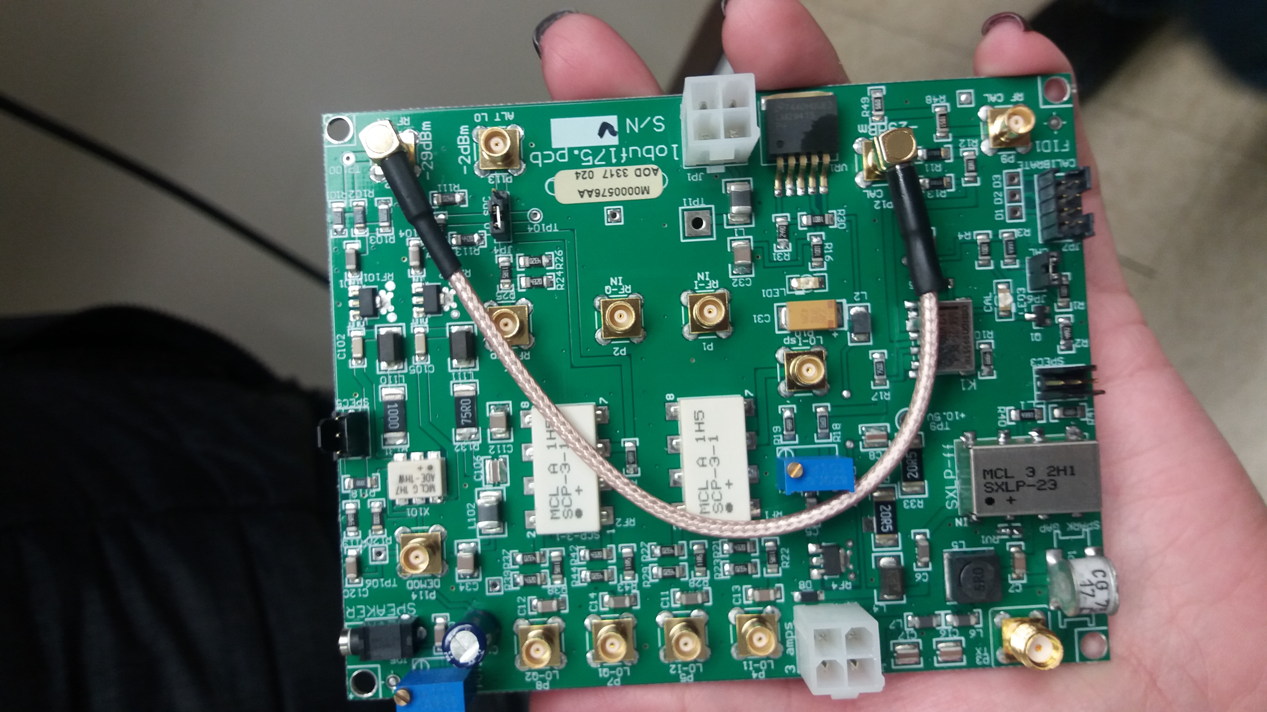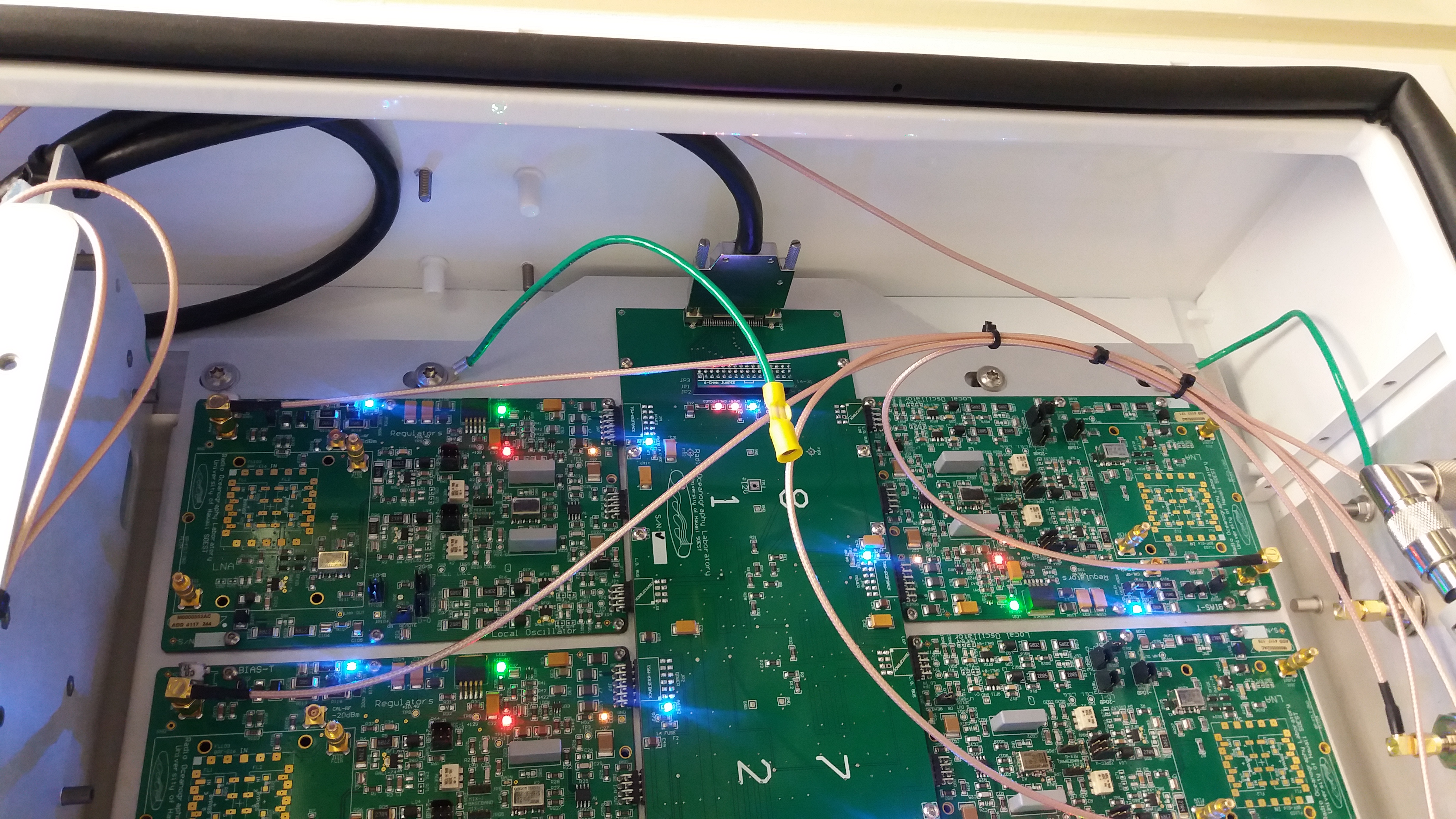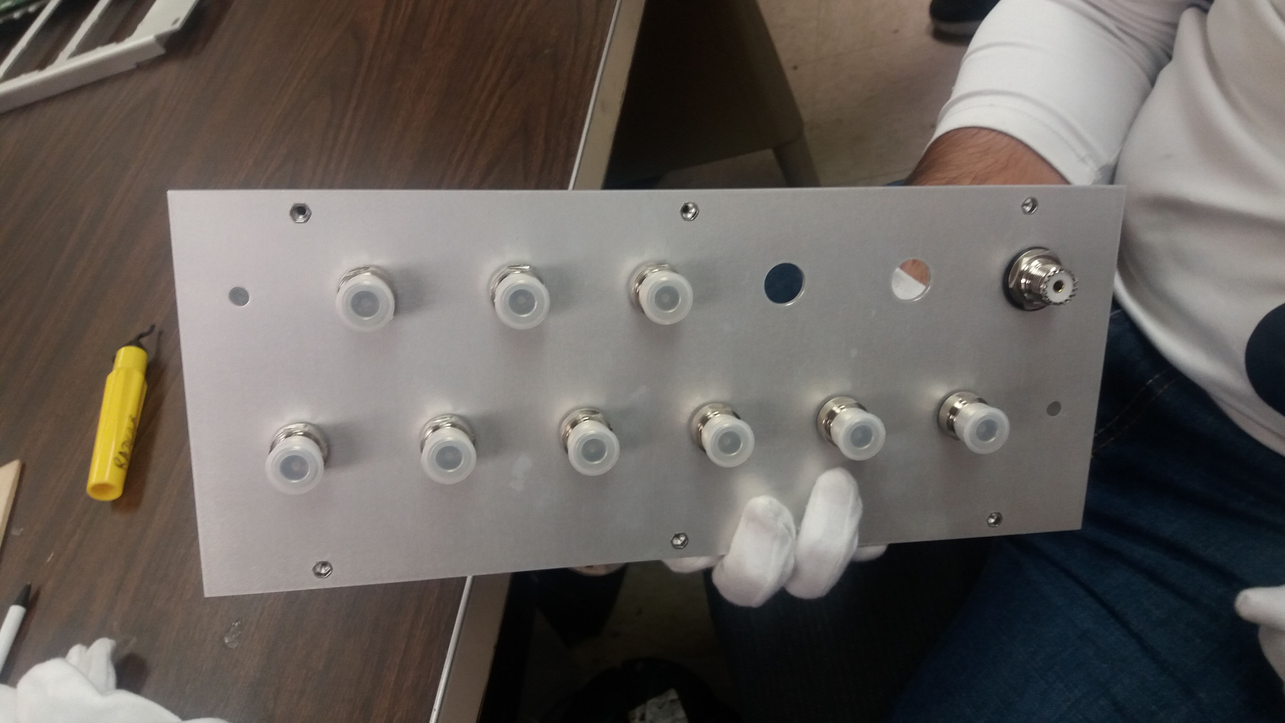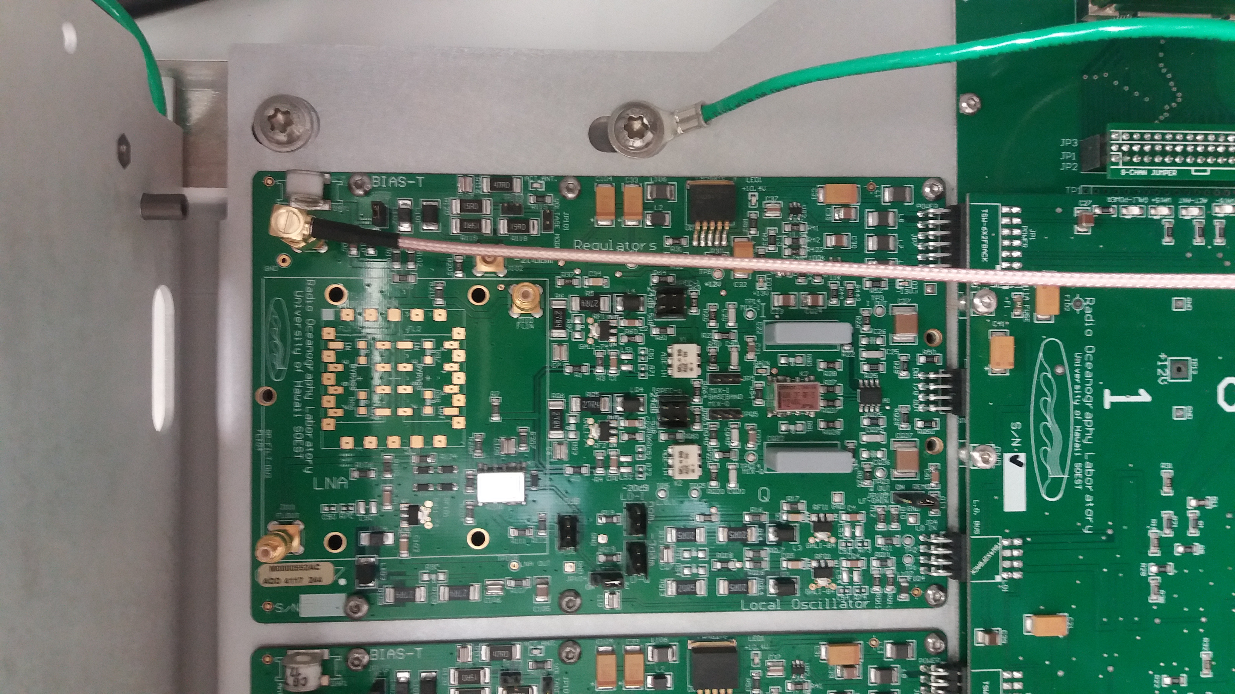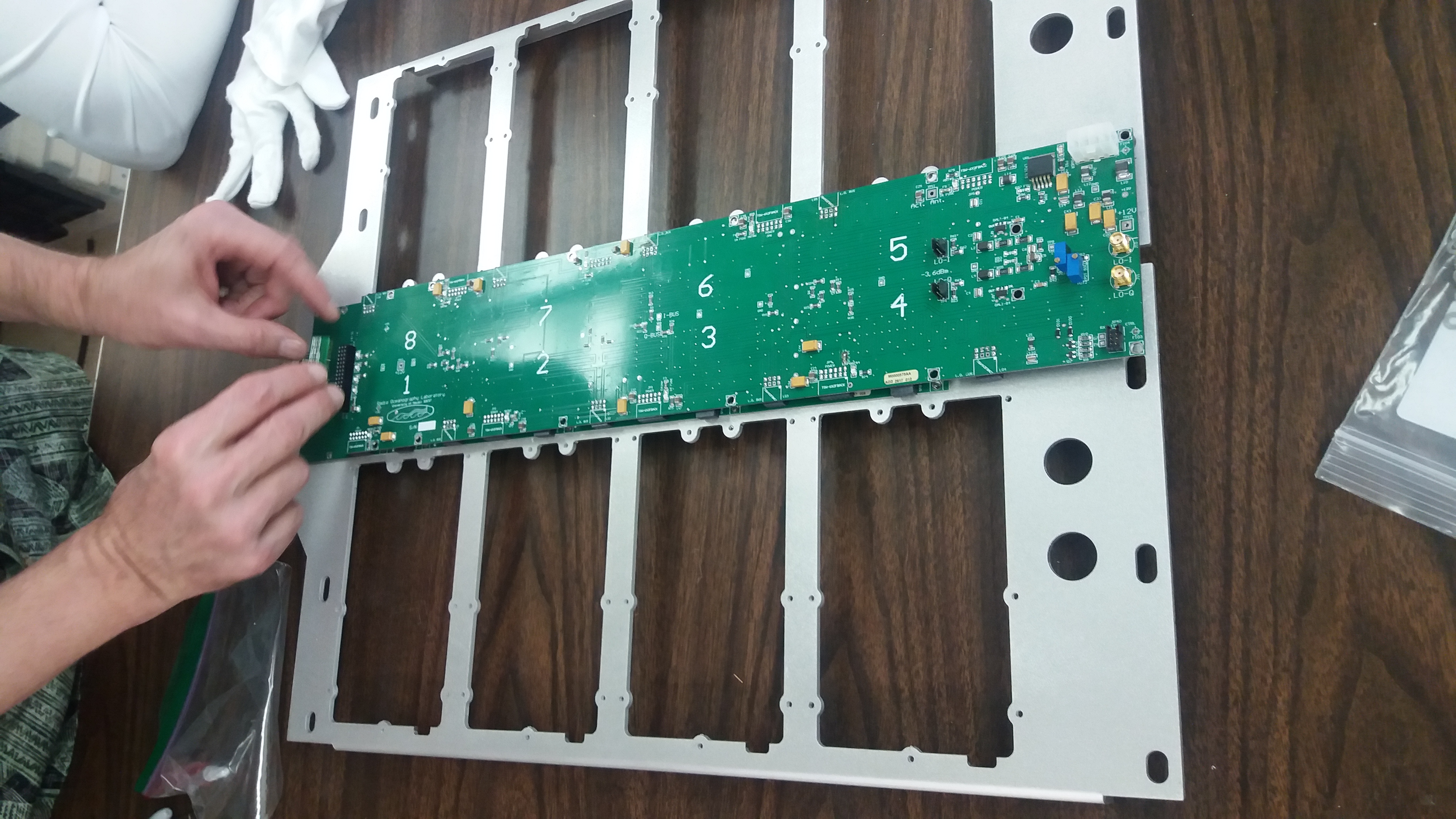 The plates are assembled on which the 8 crx cards will be placed. (Be careful with these plates because they can break if force is applied at certain points). The plates are going to be joined with 4 screws in the center and a glue (network) is applied so that they do not come loose (this will be placed at the end of the screw, the excess is removed). We must ensure that the two plates are even because above this anger the first plate with the antenna numbering (analog back plane) and it is important that they are even the bottom plates (preferably on a flat surface, it does not matter if the tabs are not at the same level, the important thing is that the top is at the same level. The first plate (analog black plane) is placed and on top of that the other plate is placed (LO back plane). To this plate we have to put the pins of the jumper, one is placed first and then others and on those the card will be soldered (circuit). The two plates are screwed to the base with 10 screws. Between the two plates are placed black spacers a single washer so that the connectors to the upper and lower plates are aligned. After installation, but thread lock onto the screws from underneath. Before putting the plate to the aluminum structure, you must check the length of the screws, so that they are not touching the bottom of the structure. At the end of the screw the glue (blue) is applied and excesses are cleaned. Note = the screws on the edge of the plate are shorter. Connect coaxial cables Before connecting the coaxial cables of the crx-8 plates to the antenna connectors, the liquid should be applied to clean connectors (contac lubricam) in order to avoid corroding (it should be applied a little more, avoid excesses) . It should also be put on the connectors where you can get noise like the scsi and the jumper. Power distribution supplies To have the complete plates of the vicor board the first thing that was done was to solder a resistance to the circuit and later a vicor module (v28c15c100bl) was incorporated in the lower part and the pins were soldered in the circuit, it is important that the welding cover the pin center and pass through the center of the pin to the bottom of the plate. The output of the plate must be 12.5 volts. (note = if we use 8 channels we will use 2 of these board and if we have 4 channels we use 1). Also, screw the little screws on the green connectors all the way in so they do not fall off. These circuits are put in turn in another base that is installed in the large structure (box), at the base of the vicor module a glue is applied and it is spread all over the base of this before putting it in the base, it is to ensure that the entrance of the vicor board that is being installed is on the correct side where it is going to connect with the input terminal board, in the holes where the vicor board is to be screwed, blue glue is applied. To install it is placed at the base of the vicor module on the other base and the base is moved a little to spread the pagemento but only a little. In the lower part of the base is applied glue and in the heat had (barilla) also before inserting in the orifices (if two plates are used also two heat pipes are used, care must be taken to install the correct side tuvos of heat). In the lower part of the plate glue is spread trying to cover where are the heat tuvos and part of the plate, also draw a square where the plate will go in the structure and also add glue. (NOTE = it is important that when the whole plate is installed in the structure it does not have the input card terminal because with the screw of the structure it does not fit well, so first the plate is placed in the structure and blue glue is applied to it. screw and then the input terminal card will be installed). You must clean excess glue. And they are going to put additional screws because the glue was coming out to the top of the plate. After everything is installed on the board, two cables will be connected per board between the vicor board and the input terminal board (if it has 8 channels, there will be 2 vicor board so 4 cables will be connected between the vicor board and the input terminal card). The black wire will always go in the row above (-) and the red in the row below (+), can be connected in any of the screws does not matter, except for the first one that corresponds to the ground in the input terminal, on the vicor board in the same way it is corroborated that the black wire is in the screw that says (-) and the red in which it says (+). On the other hand, at the output of the vicor board another 11 "cable is connected (make sure that black is on (-) and red on (+)) that goes to the power distribution. if you have 2 vicor plate there will be two cables that go to the power distribution plate, but if you have only one vicor in the same way you need the two cables, only in the vicor the two cables will be connected in the same place but in the power distribution anger connected as if we had two vicor plate). Antenna adapters (connector plate) The type M power connector (VHF connector) was installed in the lower right (for this the size of the hole had to be enlarged to 7.2 mm (confirm measurement)). To place the connector it put a nut, a guacha and an O-ring on the bottom (out) and on the top (in) a guacha and a nut. Later in the holes of the upper part we installed connectors type SMA to type N and in 3 holes of the lower left row (nut, guacha, plate in the upper part). to adjust kegs use 19 mm and 18 mm keys, so they are aligned. Note = if only 4 channels are used, black plugs are placed on the channels that are not going to be used. In the other two holes a gray plastic pressure plug was placed (it is placed towards the lower part (out)), before placing them with the deburring, the hole was softened and silicon (Heavy Duty silicone) was applied to lubricate them. Before installing the plate in the structure (box) apply blue glue in the screw holes (so that it doe