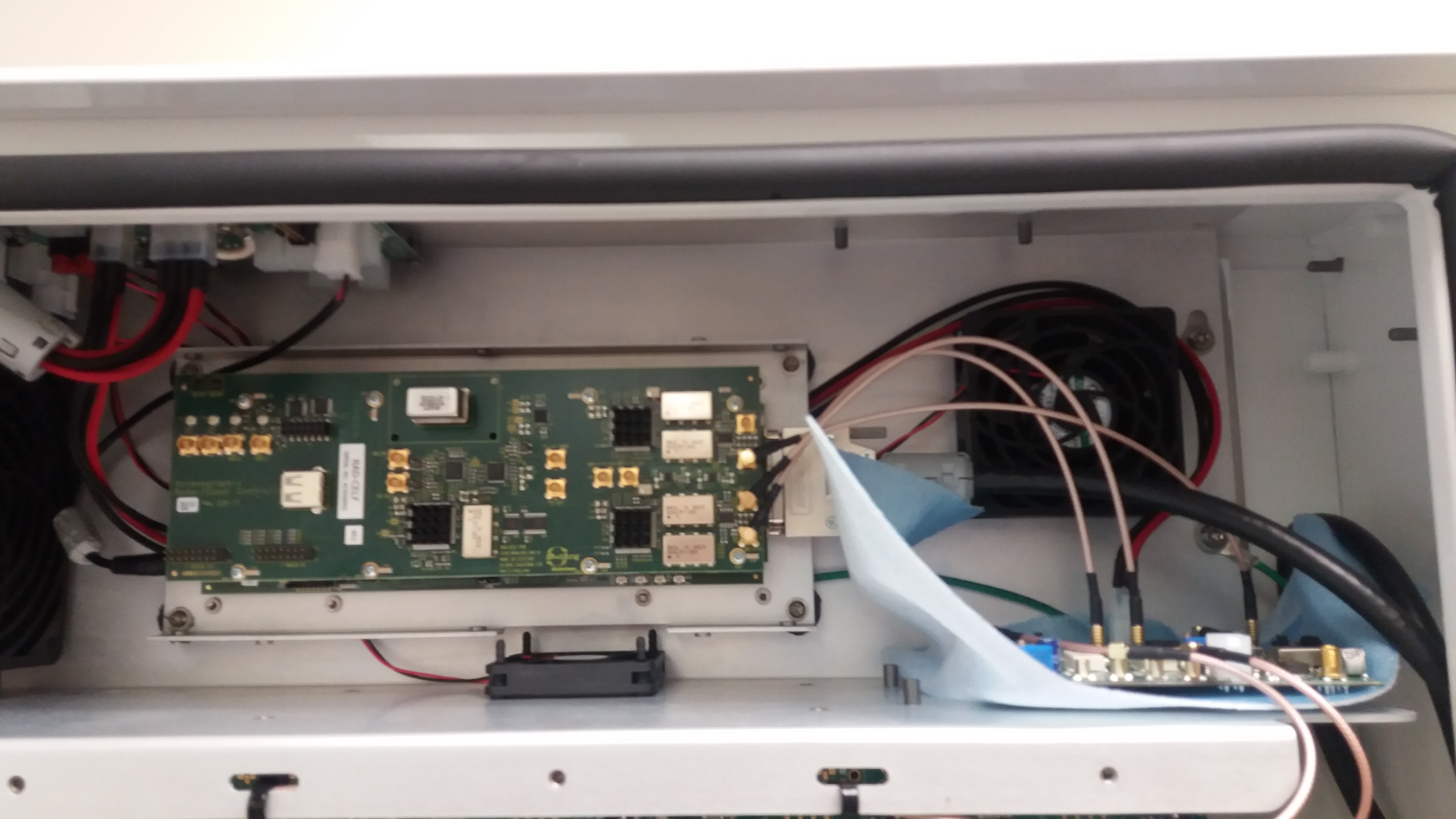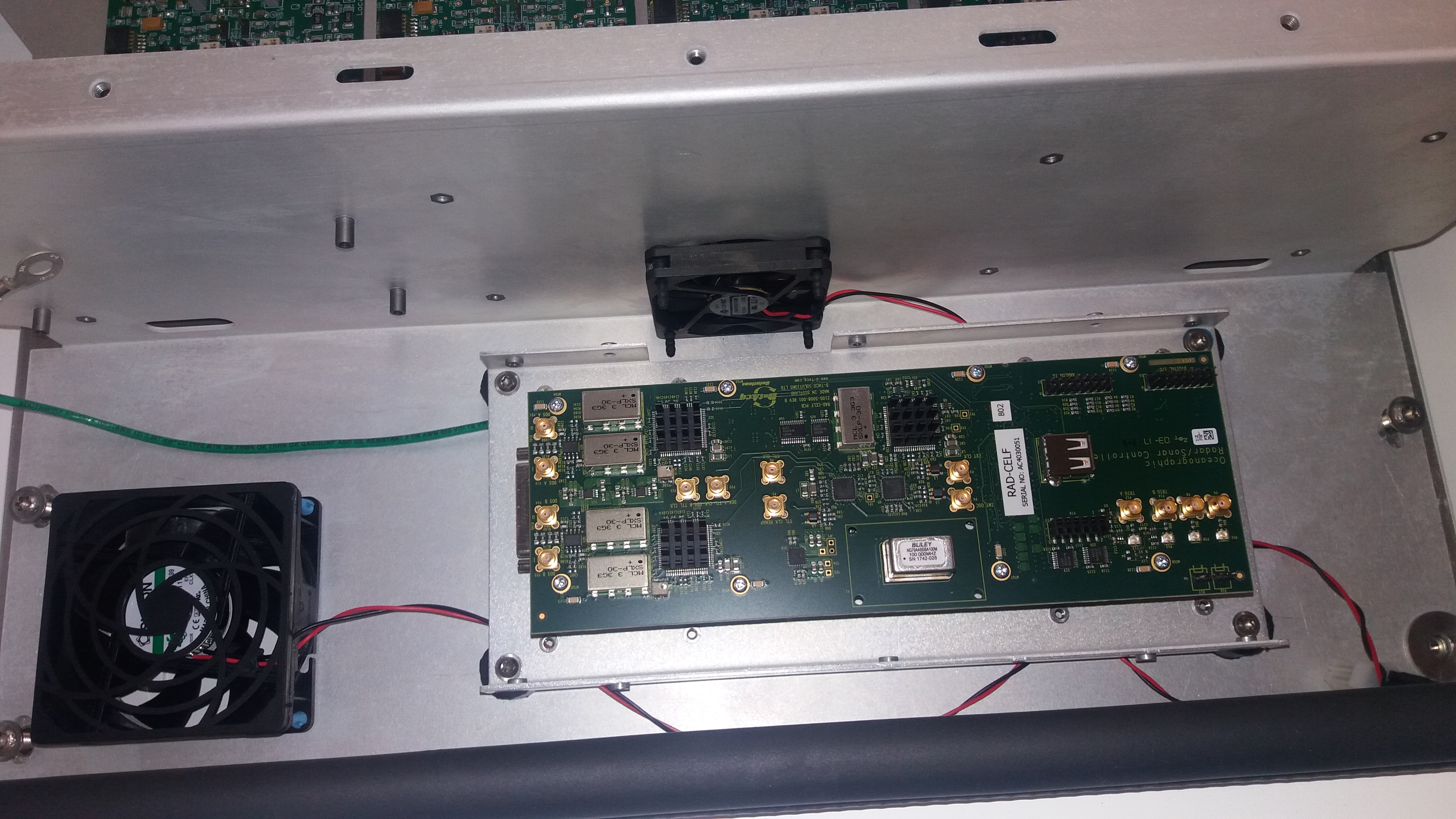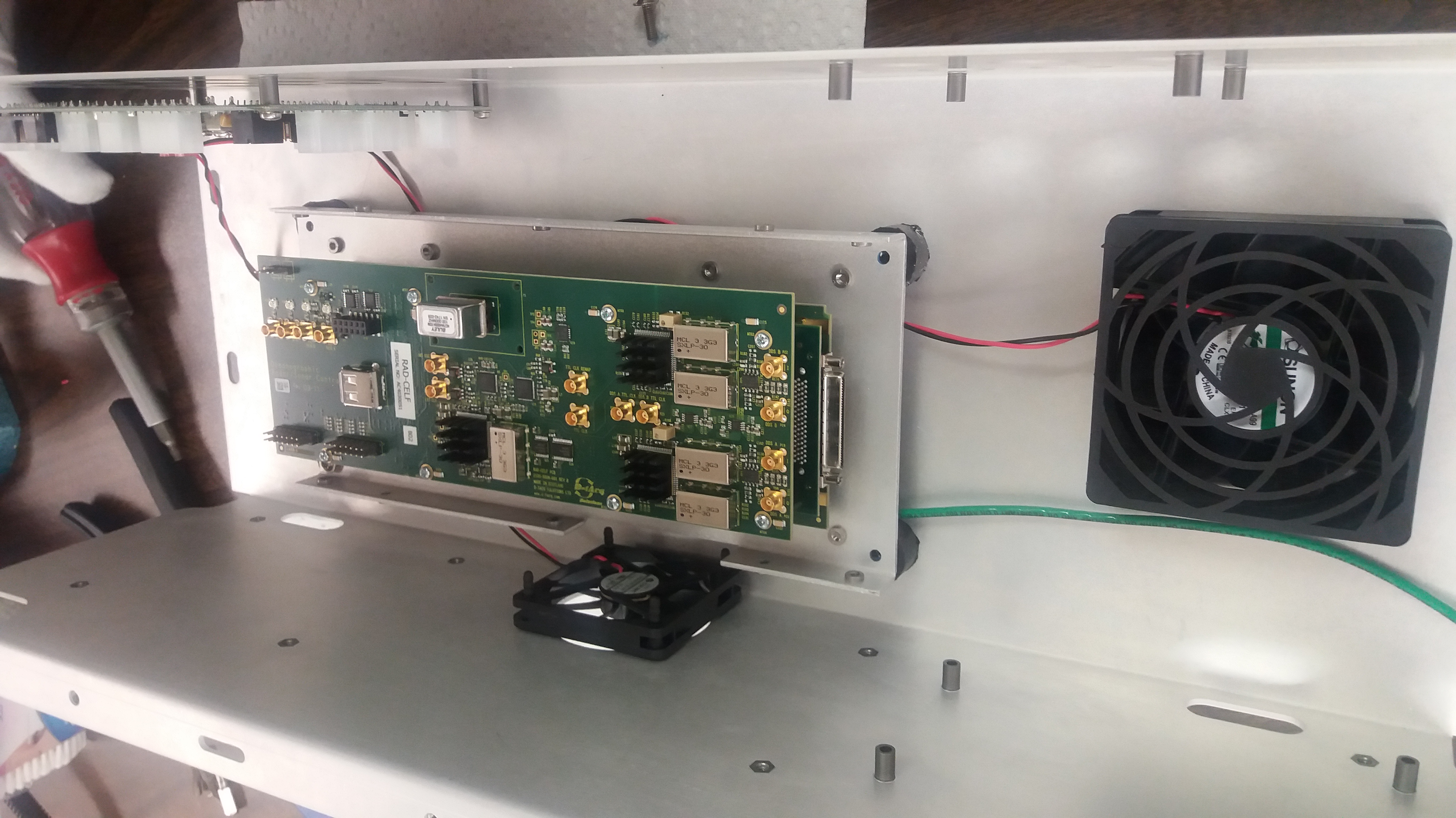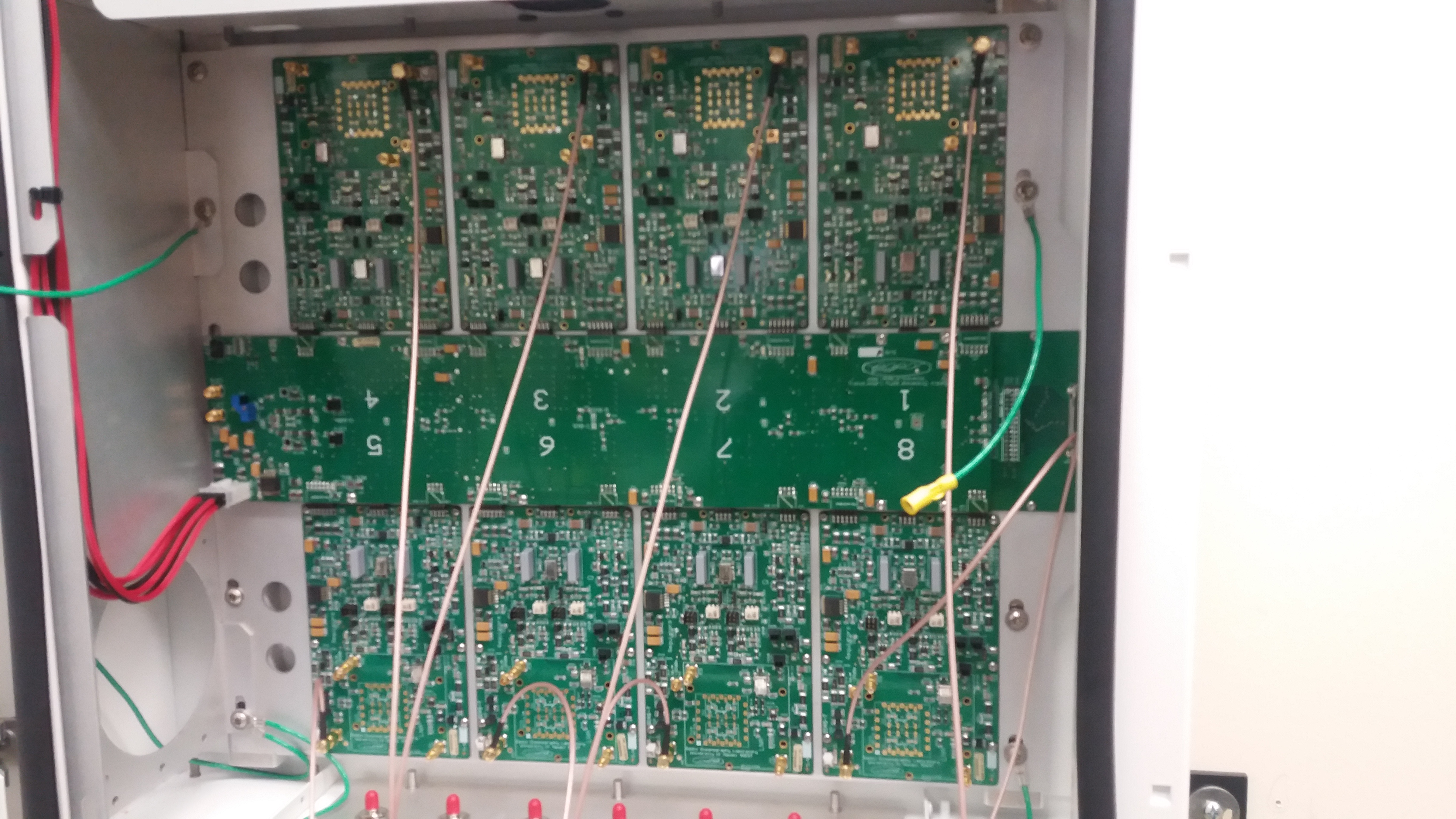 The plates are assembled on which the 8 crx cards will be placed. (Be careful with these plates because they can break if force is applied at certain points). The plates are going to be joined with 4 screws in the center and a glue (network) is applied so that they do not come loose (this will be placed at the end of the screw, the excess is removed). We must ensure that the two plates are even because above this anger the first plate with the antenna numbering (analog back plane) and it is important that they are even the bottom plates (preferably on a flat surface, it does not matter if the tabs are not at the same level, the important thing is that the top is at the same level. The first plate (analog black plane) is placed and on top of that the other plate is placed (LO back plane). To this plate we have to put the pins of the jumper, one is placed first and then others and on those the card will be soldered (circuit). The two plates are screwed to the base with 10 screws. Between the two plates are placed black spacers a single washer so that the connectors to the upper and lower plates are aligned. After installation, but thread lock onto the screws from underneath. Before putting the plate to the aluminum structure, you must check the length of the screws, so that they are not touching the bottom of the structure. At the end of the screw the glue (blue) is applied and excesses are cleaned. Note = the screws on the edge of the plate are shorter. Connect coaxial cables Before connecting the coaxial cables of the crx-8 plates to the antenna connectors, the liquid should be applied to clean connectors (contac lubricam) in order to avoid corroding (it should be applied a little more, avoid excesses) . It should also be put on the connectors where you can get noise like the scsi and the jumper. Power distribution supplies To have the complete plates of the vicor board the first thing that was done was to solder a resistance to the circuit and later a vicor module (v28c15c100bl) was incorporated in the lower part and the pins were soldered in the circuit, it is important that the welding cover the pin center and pass through the center of the pin to the bottom of the plate. The output of the plate must be 12.5 volts. (note = if we use 8 channels we will use 2 of these board and if we have 4 channels we use 1). Also, screw the little screws on the green connectors all the way in so they do not fall off. These circuits are put in turn in another base that is installed in the large structure (box), at the base of the vicor module a glue is applied and it is spread all over the base of this before putting it in the base, it is to ensure that the entrance of the vicor board that is being installed is on the correct side where it is going to connect with the input terminal board, in the holes where the vicor board is to be screwed, blue glue is applied. To install it is placed at the base of the vicor module on the other base and the base is moved a little to spread the pagemento but only a little. In the lower part of the base is applied glue and in the heat had (barilla) also before inserting in the orifices (if two plates are used also two heat pipes are used, care must be taken to install the correct side tuvos of heat). In the lower part of the plate glue is spread trying to cover where are the heat tuvos and part of the plate, also draw a square where the plate will go in the structure and also add glue. (NOTE = it is important that when the whole plate is installed in the structure it does not have the input card terminal because with the screw of the structure it does not fit well, so first the plate is placed in the structure and blue glue is applied to it. screw and then the input terminal card will be installed). You must clean excess glue. And they are going to put additional screws because the glue was coming out to the top of the plate. After everything is installed on the board, two cables will be connected per board between the vicor board and the input terminal board (if it has 8 channels, there will be 2 vicor board so 4 cables will be connected between the vicor board and the input terminal card). The black wire will always go in the row above (-) and the red in the row below (+), can be connected in any of the screws does not matter, except for the first one that corresponds to the ground in the input terminal, on the vicor board in the same way it is corroborated that the black wire is in the screw that says (-) and the red in which it says (+). On the other hand, at the output of the vicor board another 11 "cable is connected (make sure that black is on (-) and red on (+)) that goes to the power distribution. if you have 2 vicor plate there will be two cables that go to the power distribution plate, but if you have only one vicor in the same way you need the two cables, only in the vicor the two cables will be connected in the same place but in the power distribution anger connected as if we had two vicor plate). Antenna adapters (connector plate) The type M power connector (VHF connector) was installed in the lower right (for this the size of the hole had to be enlarged to 7.2 mm (confirm measurement)). To place the connector it put a nut, a guacha and an O-ring on the bottom (out) and on the top (in) a guacha and a nut. Later in the holes of the upper part we installed connectors type SMA to type N and in 3 holes of the lower left row (nut, guacha, plate in the upper part). to adjust kegs use 19 mm and 18 mm keys, so they are aligned. Note = if only 4 channels are used, black plugs are placed on the channels that are not going to be used. In the other two holes a gray plastic pressure plug was placed (it is placed towards the lower part (out)), before placing them with the deburring, the hole was softened and silicon (Heavy Duty silicone) was applied to lubricate them. Before installing the plate in the structure (box) apply blue glue in the screw holes (so that it doe