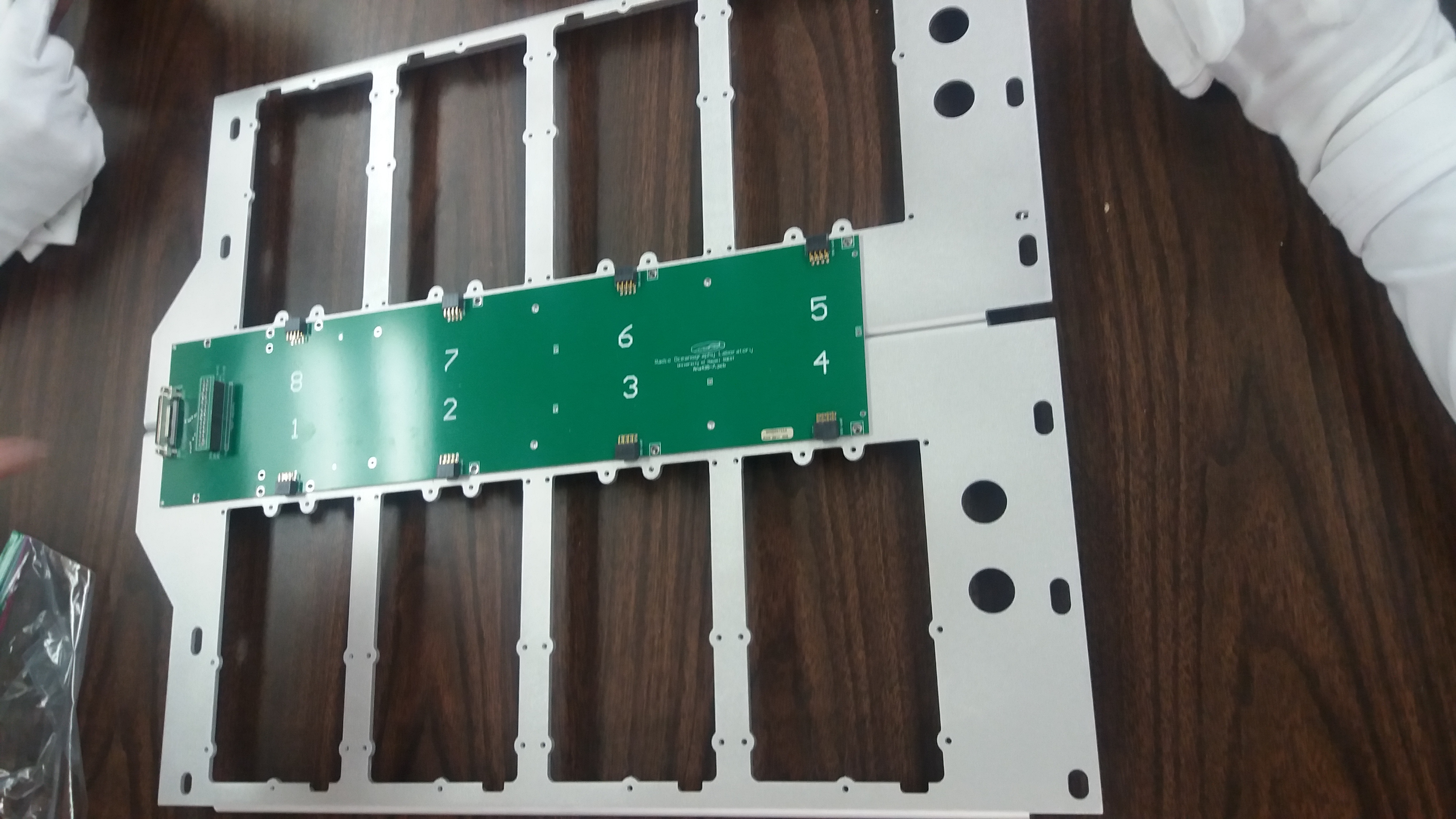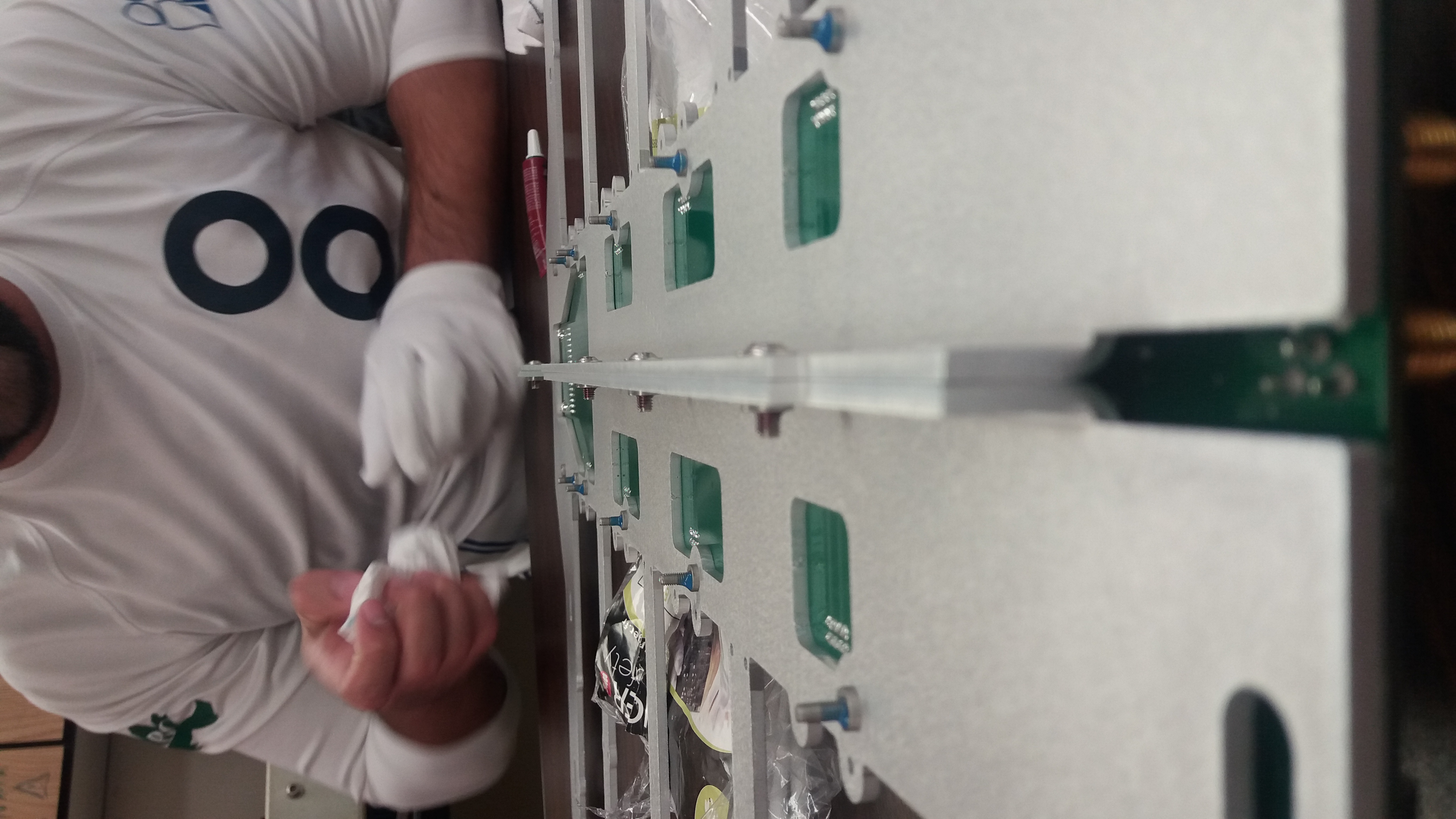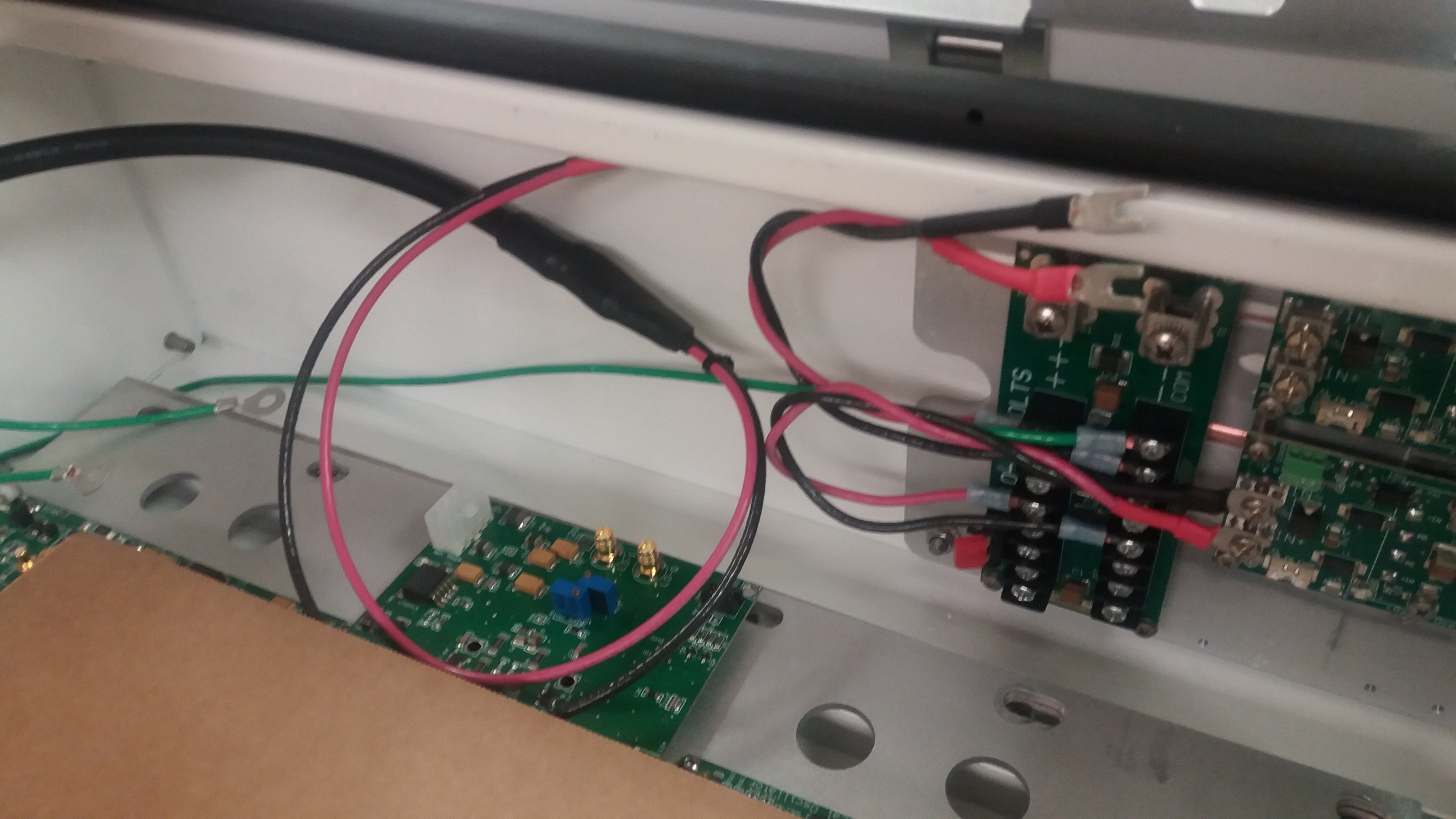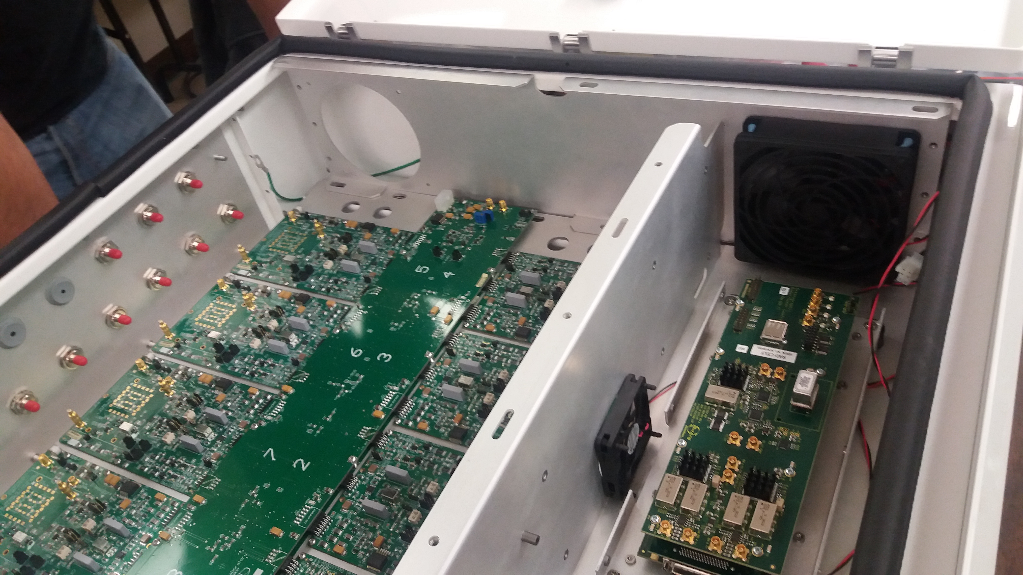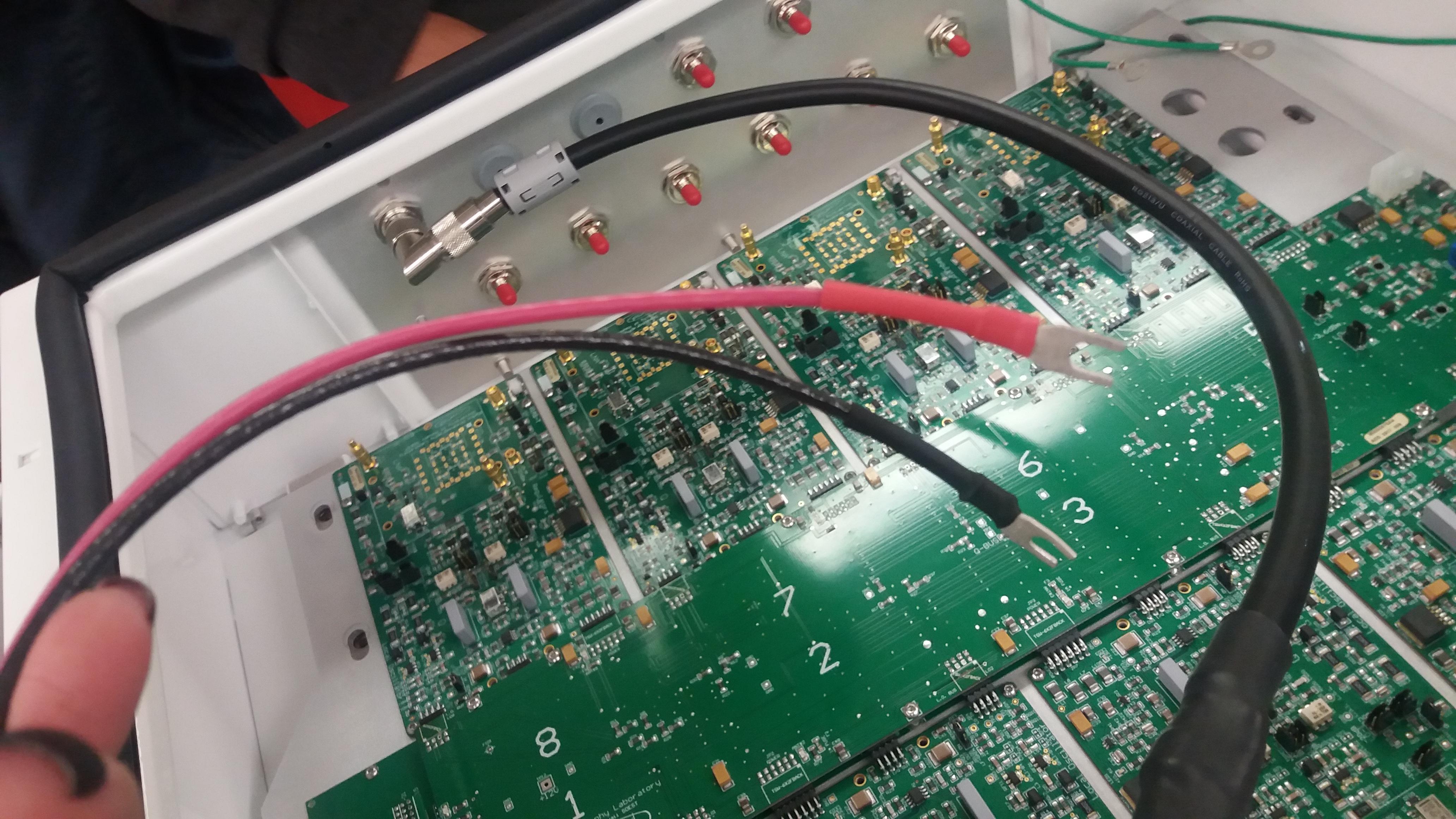 The plates are assembled on which the 8 crx cards will be placed. (Be careful with these plates because they can break if force is applied at certain points). The plates are going to be joined with 4 screws in the center and a glue (network) is applied so that they do not come loose (this will be placed at the end of the screw, the excess is removed). We must ensure that the two plates are even because above this anger the first plate with the antenna numbering (analog back plane) and it is important that they are even the bottom plates (preferably on a flat surface, it does not matter if the tabs are not at the same level, the important thing is that the top is at the same level. The first plate (analog black plane) is placed and on top of that the other plate is placed (LO back plane). To this plate we have to put the pins of the jumper, one is placed first and then others and on those the card will be soldered (circuit). The two plates are screwed to the base with 10 screws. Between the two plates are placed black spacers a single washer so that the connectors to the upper and lower plates are aligned. After installation, but thread lock onto the screws from underneath. Before putting the plate to the aluminum structure, you must check the length of the screws, so that they are not touching the bottom of the structure. At the end of the screw the glue (blue) is applied and excesses are cleaned. Note = the screws on the edge of the plate are shorter. Connect coaxial cables Before connecting the coaxial cables of the crx-8 plates to the antenna connectors, the liquid should be applied to clean connectors (contac lubricam) in order to avoid corroding (it should be applied a little more, avoid excesses) . It should also be put on the connectors where you can get noise like the scsi and the jumper. Power distribution supplies To have the complete plates of the vicor board the first thing that was done was to solder a resistance to the circuit and later a vicor module (v28c15c100bl) was incorporated in the lower part and the pins were soldered in the circuit, it is important that the welding cover the pin center and pass through the center of the pin to the bottom of the plate. The output of the plate must be 12.5 volts. (note = if we use 8 channels we will use 2 of these board and if we have 4 channels we use 1). Also, screw the little screws on the green connectors all the way in so they do not fall off. These circuits are put in turn in another base that is installed in the large structure (box), at the base of the vicor module a glue is applied and it is spread all over the base of this before putting it in the base, it is to ensure that the entrance of the vicor board that is being installed is on the correct side where it is going to connect with the input terminal board, in the holes where the vicor board is to be screwed, blue glue is applied. To install it is placed at the base of the vicor module on the other base and the base is moved a little to spread the pagemento but only a little. In the lower part of the base is applied glue and in the heat had (barilla) also before inserting in the orifices (if two plates are used also two heat pipes are used, care must be taken to install the correct side tuvos of heat). In the lower part of the plate glue is spread trying to cover where are the heat tuvos and part of the plate, also draw a square where the plate will go in the structure and also add glue. (NOTE = it is important that when the whole plate is installed in the structure it does not have the input card terminal because with the screw of the structure it does not fit well, so first the plate is placed in the structure and blue glue is applied to it. screw and then the input terminal card will be installed). You must clean excess glue. And they are going to put additional screws because the glue was coming out to the top of the plate. After everything is installed on the board, two cables will be connected per board between the vicor board and the input terminal board (if it has 8 channels, there will be 2 vicor board so 4 cables will be connected between the vicor board and the input terminal card). The black wire will always go in the row above (-) and the red in the row below (+), can be connected in any of the screws does not matter, except for the first one that corresponds to the ground in the input terminal, on the vicor board in the same way it is corroborated that the black wire is in the screw that says (-) and the red in which it says (+). On the other hand, at the output of the vicor board another 11 "cable is connected (make sure that black is on (-) and red on (+)) that goes to the power distribution. if you have 2 vicor plate there will be two cables that go to the power distribution plate, but if you have only one vicor in the same way you need the two cables, only in the vicor the two cables will be connected in the same place but in the power distribution anger connected as if we had two vicor plate). Antenna adapters (connector plate) The type M power connector (VHF connector) was installed in the lower right (for this the size of the hole had to be enlarged to 7.2 mm (confirm measurement)). To place the connector it put a nut, a guacha and an O-ring on the bottom (out) and on the top (in) a guacha and a nut. Later in the holes of the upper part we installed connectors type SMA to type N and in 3 holes of the lower left row (nut, guacha, plate in the upper part). to adjust kegs use 19 mm and 18 mm keys, so they are aligned. Note = if only 4 channels are used, black plugs are placed on the channels that are not going to be used. In the other two holes a gray plastic pressure plug was placed (it is placed towards the lower part (out)), before placing them with the deburring, the hole was softened and silicon (Heavy Duty silicone) was applied to lubricate them. Before installing the plate in the structure (box) apply blue glue in the screw holes (so that it doe