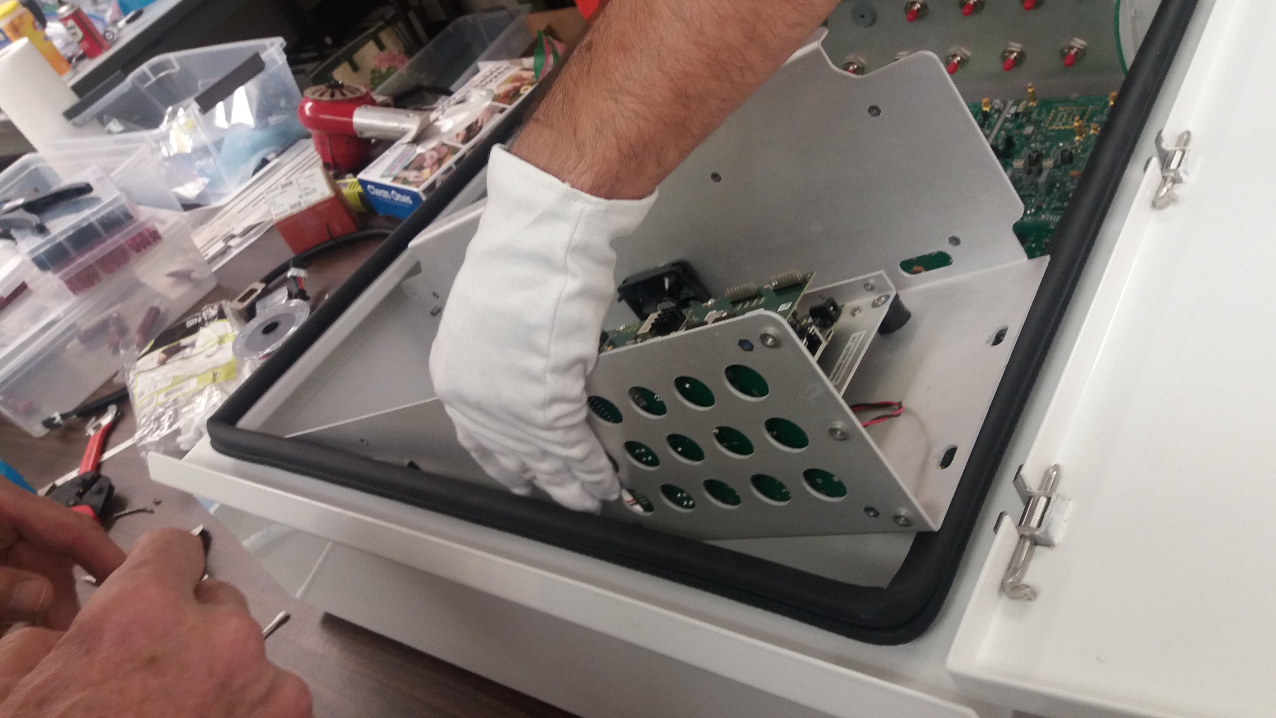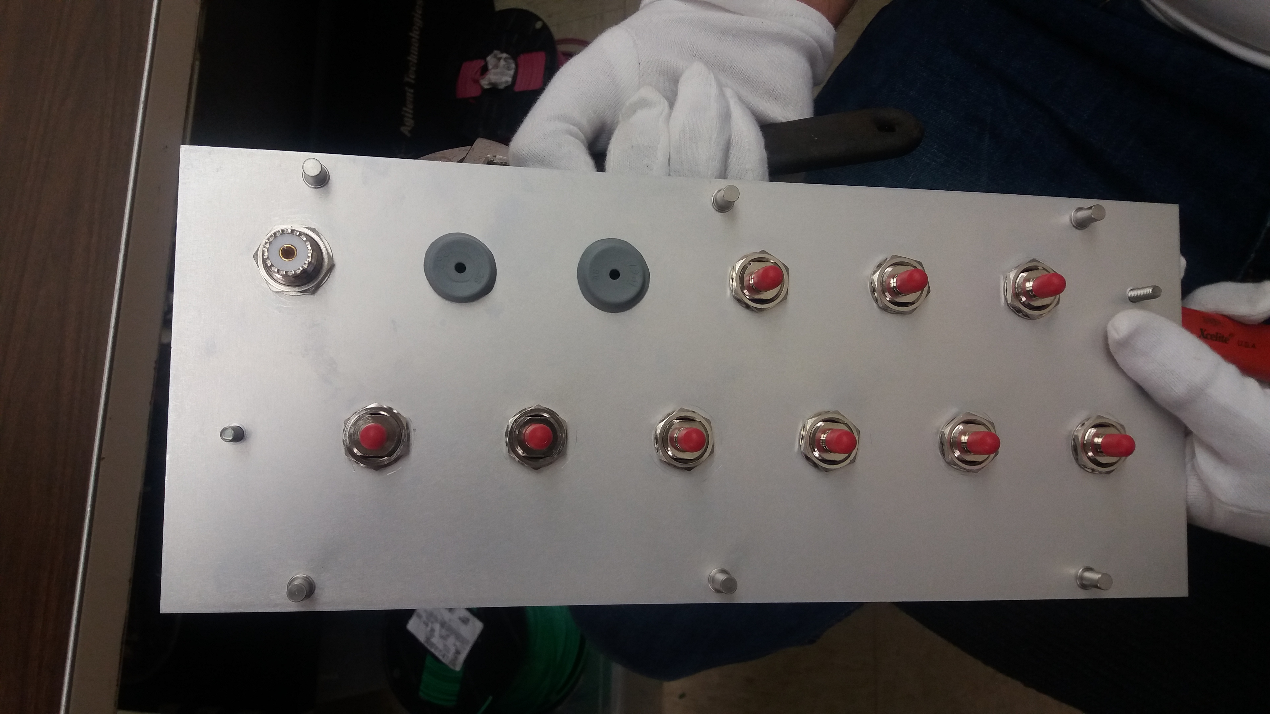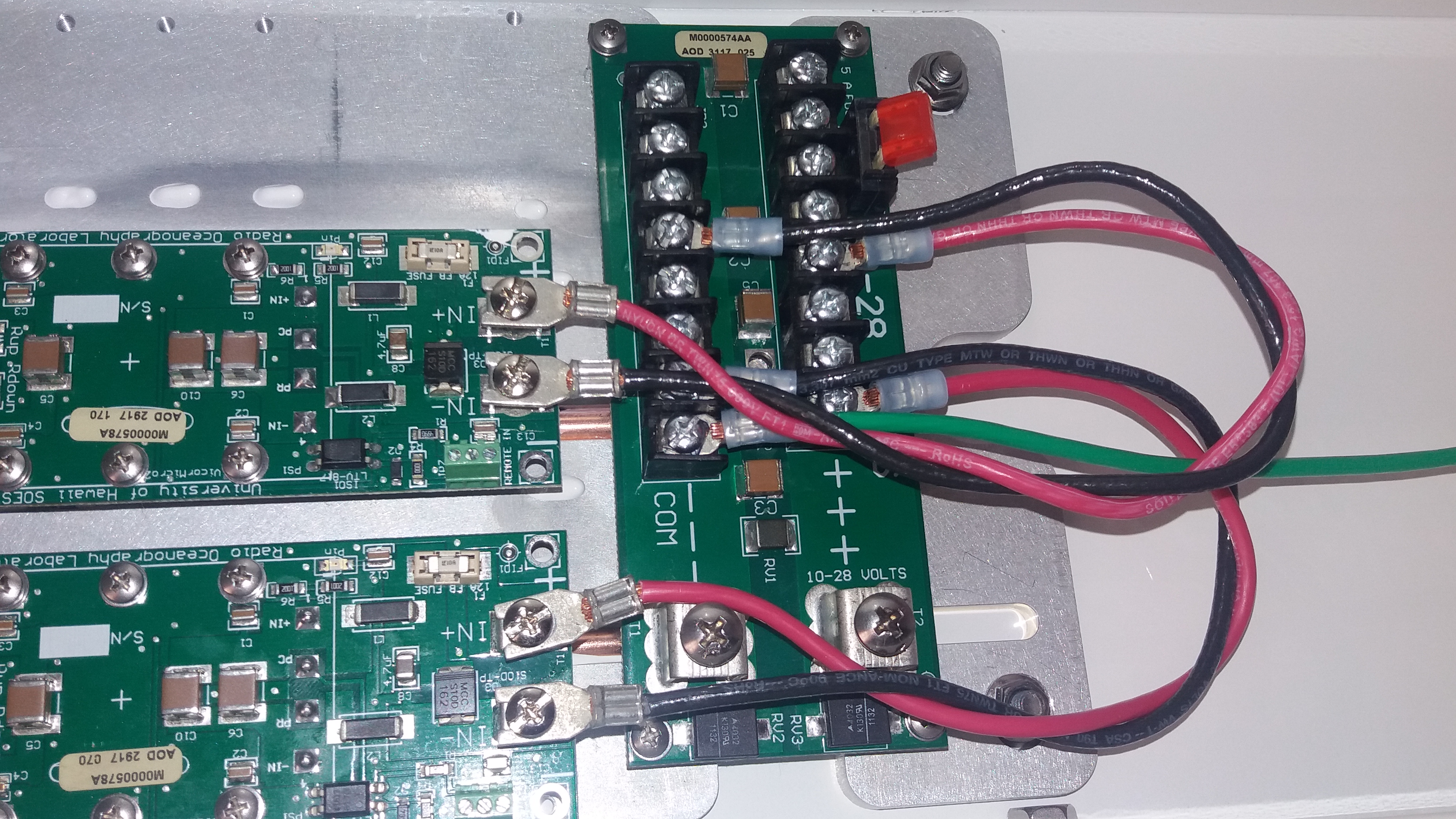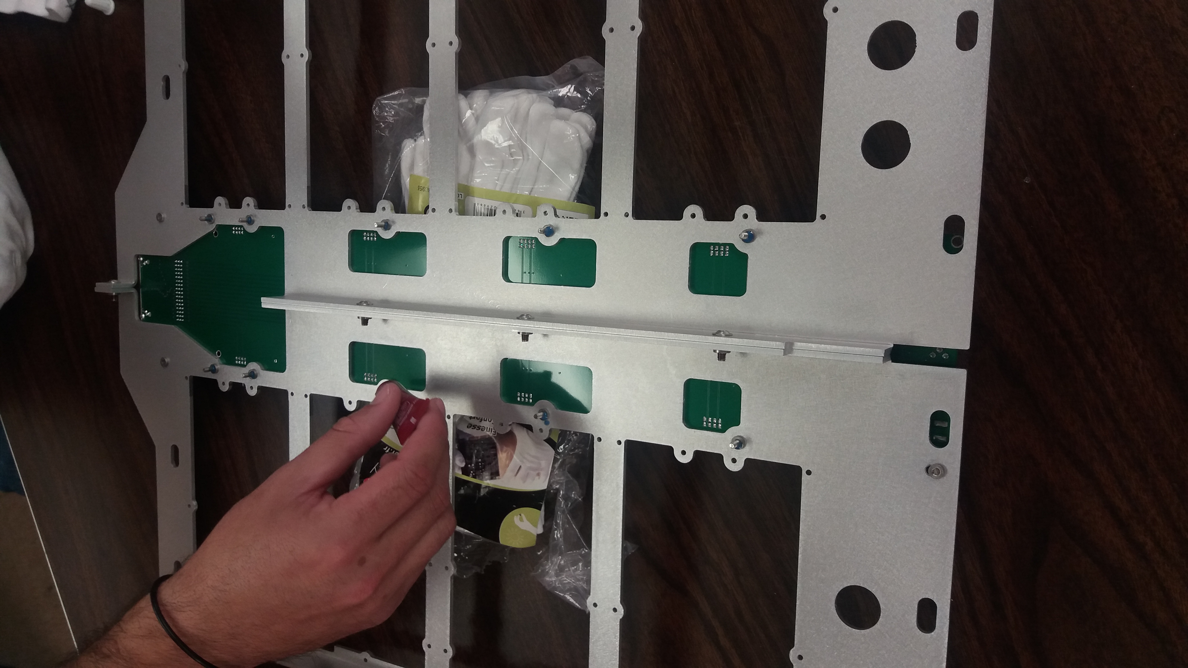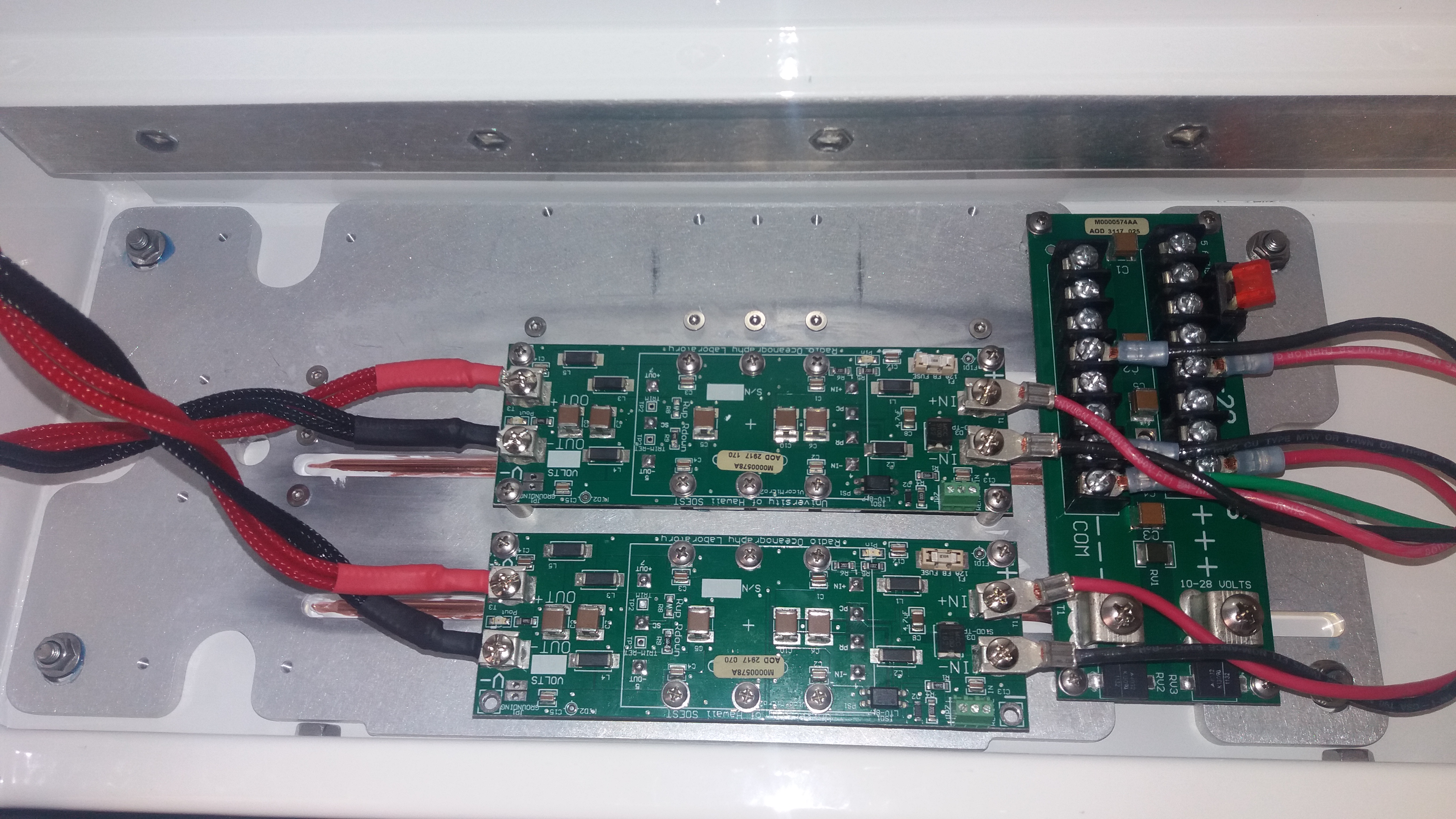The plates are assembled on which the 8 crx cards will be placed. (Be careful with these plates because they can break if force is applied at certain points). The plates are going to be joined with 4 screws in the center and a glue (network) is applied so that they do not come loose (this will be placed at the end of the screw, the excess is removed). We must ensure that the two plates are even because above this anger the first plate with the antenna numbering (analog back plane) and it is important that they are even the bottom plates (preferably on a flat surface, it does not matter if the tabs are not at the same level, the important thing is that the top is at the same level. The first plate (analog black plane) is placed and on top of that the other plate is placed (LO back plane). To this plate we have to put the pins of the jumper, one is placed first and then others and on those the card will be soldered (circuit). The two plates are screwed to the base with 10 screws. Between the two plates are placed black spacers a single washer so that the connectors to the upper and lower plates are aligned. After installation, but thread lock onto the screws from underneath. Before putting the plate to the aluminum structure, you must check the length of the screws, so that they are not touching the bottom of the structure. At the end of the screw the glue (blue) is applied and excesses are cleaned. Note = the screws on the edge of the plate are shorter. Connect coaxial cables Before connecting the coaxial cables of the crx-8 plates to the antenna connectors, the liquid should be applied to clean connectors (contac lubricam) in order to avoid corroding (it should be applied a little more, avoid excesses) . It should also be put on the connectors where you can get noise like the scsi and the jumper. Power distribution supplies To have the complete plates of the vicor board the first thing that was done was to solder a resistance to the circuit and later a vicor module (v28c15c100bl) was incorporated in the lower part and the pins were soldered in the circuit, it is important that the welding cover the pin center and pass through the center of the pin to the bottom of the plate. The output of the plate must be 12.5 volts. (note = if we use 8 channels we will use 2 of these board and if we have 4 channels we use 1). Also, screw the little screws on the green connectors all the way in so they do not fall off. These circuits are put in turn in another base that is installed in the large structure (box), at the base of the vicor module a glue is applied and it is spread all over the base of this before putting it in the base, it is to ensure that the entrance of the vicor board that is being installed is on the correct side where it is going to connect with the input terminal board, in the holes where the vicor board is to be screwed, blue glue is applied. To install it is placed at the base of the vicor module on the other base and the base is moved a little to spread the pagemento but only a little. In the lower part of the base is applied glue and in the heat had (barilla) also before inserting in the orifices (if two plates are used also two heat pipes are used, care must be taken to install the correct side tuvos of heat). In the lower part of the plate glue is spread trying to cover where are the heat tuvos and part of the plate, also draw a square where the plate will go in the structure and also add glue. (NOTE = it is important that when the whole plate is installed in the structure it does not have the input card terminal because with the screw of the structure it does not fit well, so first the plate is placed in the structure and blue glue is applied to it. screw and then the input terminal card will be installed). You must clean excess glue. And they are going to put additional screws because the glue was coming out to the top of the plate. After everything is installed on the board, two cables will be connected per board between the vicor board and the input terminal board (if it has 8 channels, there will be 2 vicor board so 4 cables will be connected between the vicor board and the input terminal card). The black wire will always go in the row above (-) and the red in the row below (+), can be connected in any of the screws does not matter, except for the first one that corresponds to the ground in the input terminal, on the vicor board in the same way it is corroborated that the black wire is in the screw that says (-) and the red in which it says (+). On the other hand, at the output of the vicor board another 11 "cable is connected (make sure that black is on (-) and red on (+)) that goes to the power distribution. if you have 2 vicor plate there will be two cables that go to the power distribution plate, but if you have only one vicor in the same way you need the two cables, only in the vicor the two cables will be connected in the same place but in the power distribution anger connected as if we had two vicor plate). Antenna adapters (connector plate) The type M power connector (VHF connector) was installed in the lower right (for this the size of the hole had to be enlarged to 7.2 mm (confirm measurement)). To place the connector it put a nut, a guacha and an O-ring on the bottom (out) and on the top (in) a guacha and a nut. Later in the holes of the upper part we installed connectors type SMA to type N and in 3 holes of the lower left row (nut, guacha, plate in the upper part). to adjust kegs use 19 mm and 18 mm keys, so they are aligned. Note = if only 4 channels are used, black plugs are placed on the channels that are not going to be used. In the other two holes a gray plastic pressure plug was placed (it is placed towards the lower part (out)), before placing them with the deburring, the hole was softened and silicon (Heavy Duty silicone) was applied to lubricate them. Before installing the plate in the structure (box) apply blue glue in the screw holes (so that it doe
