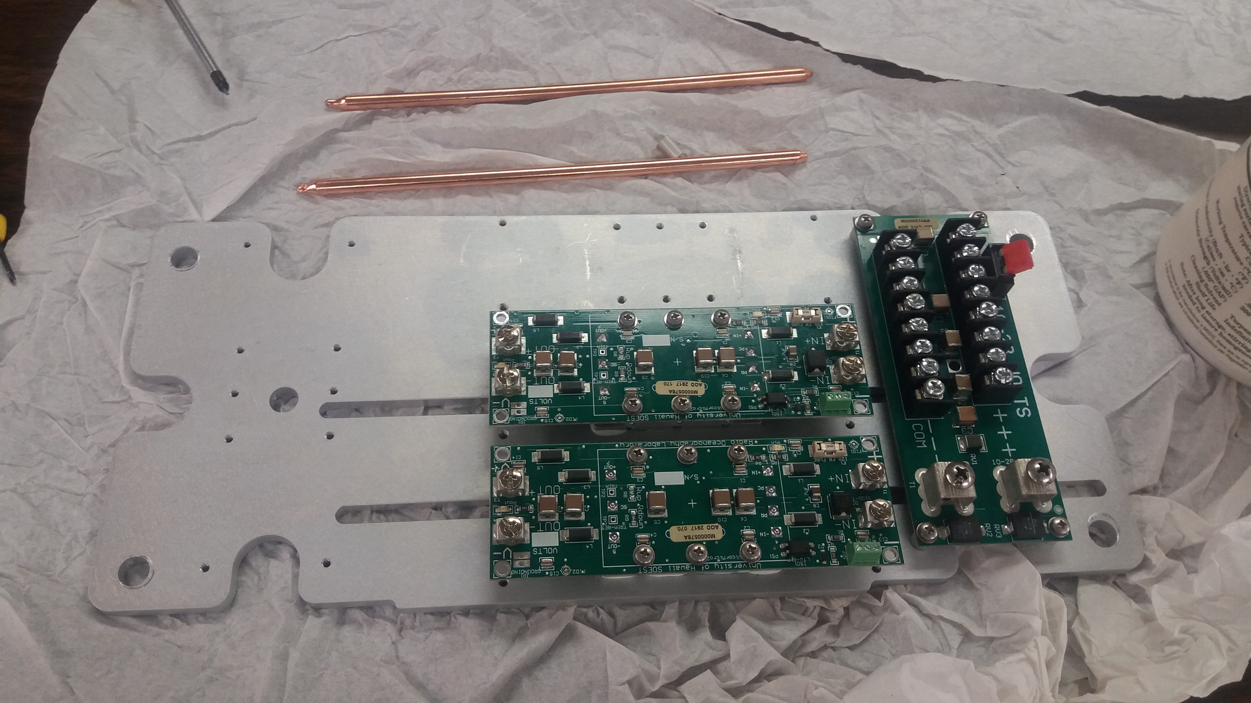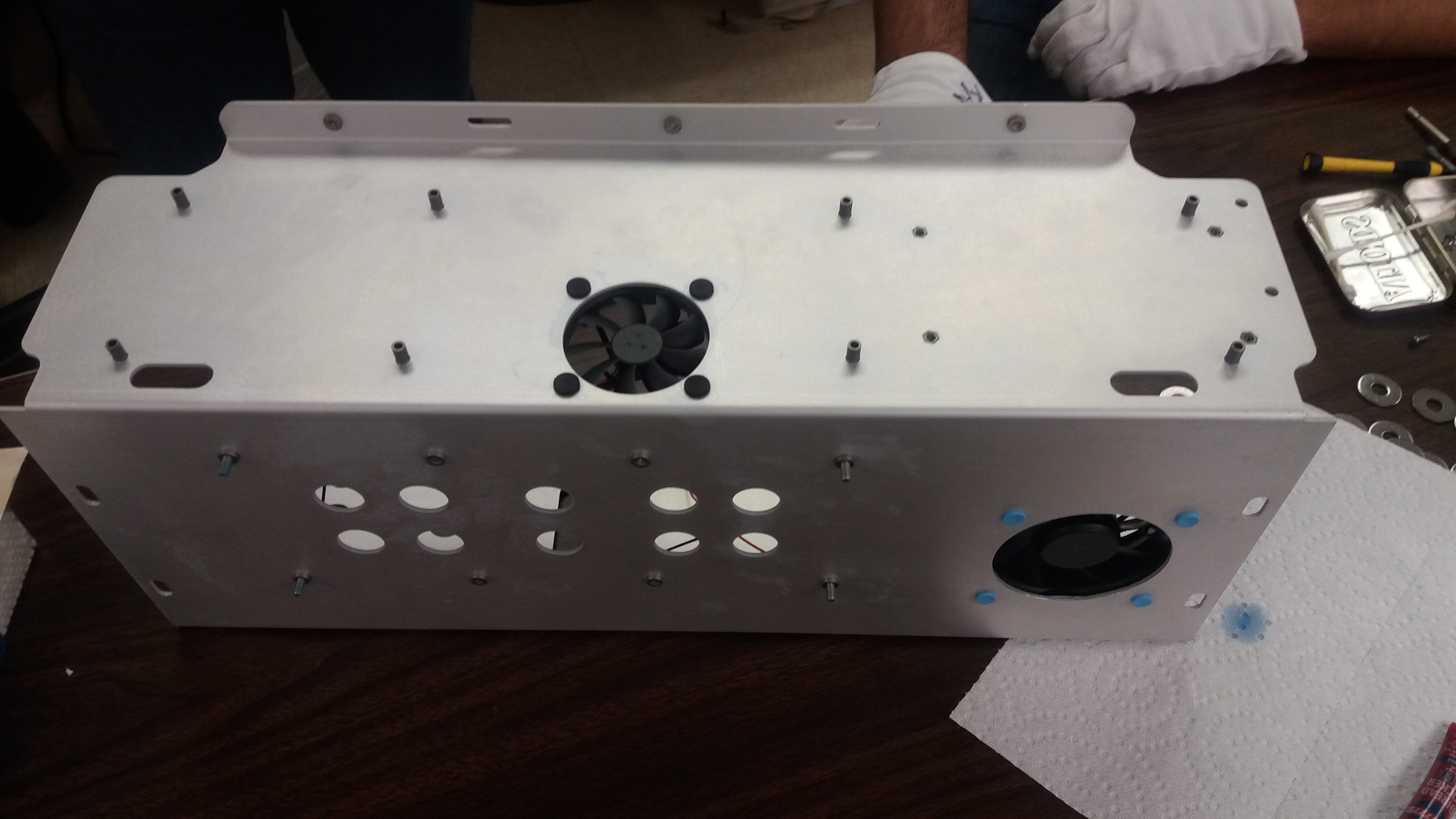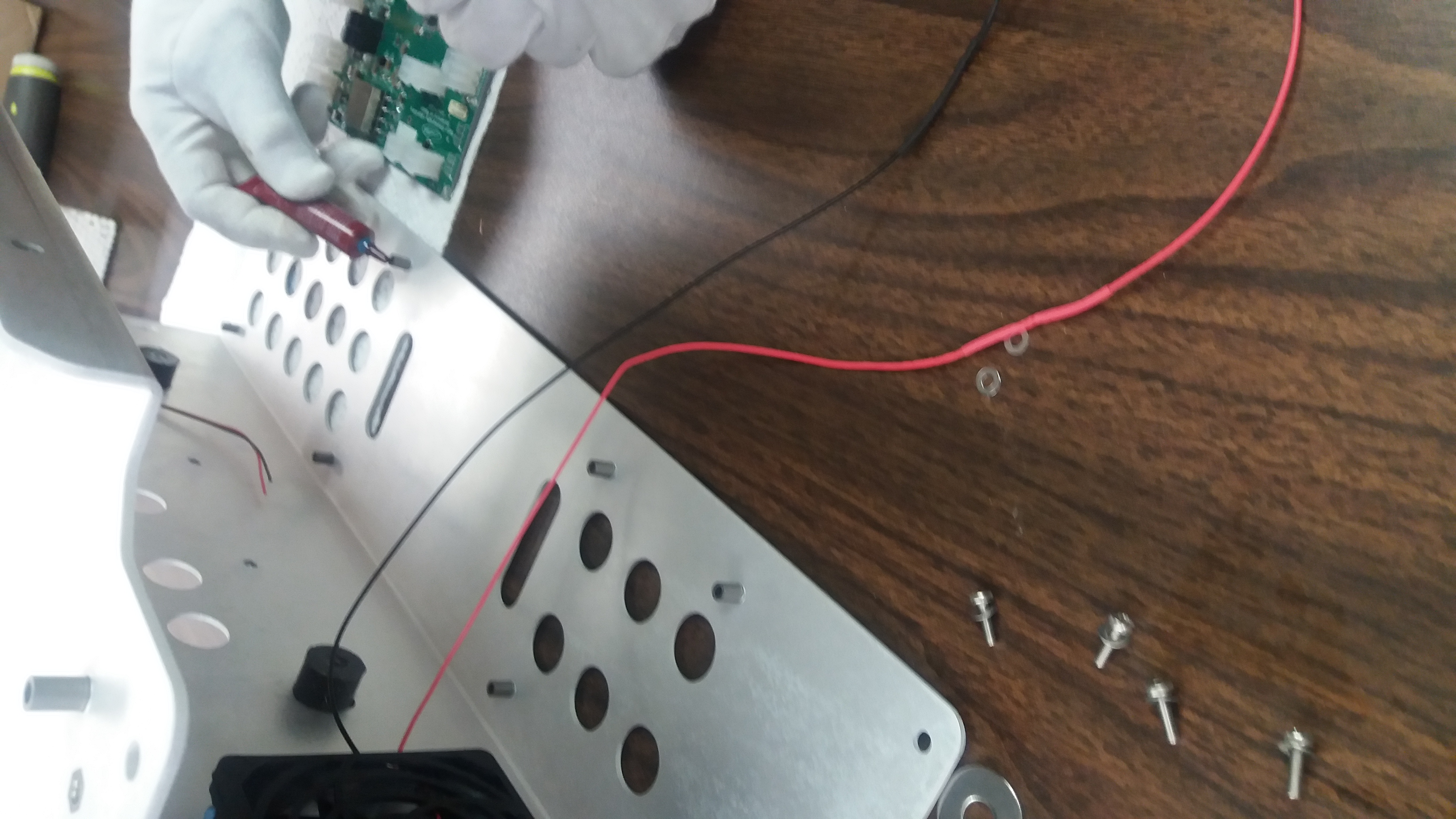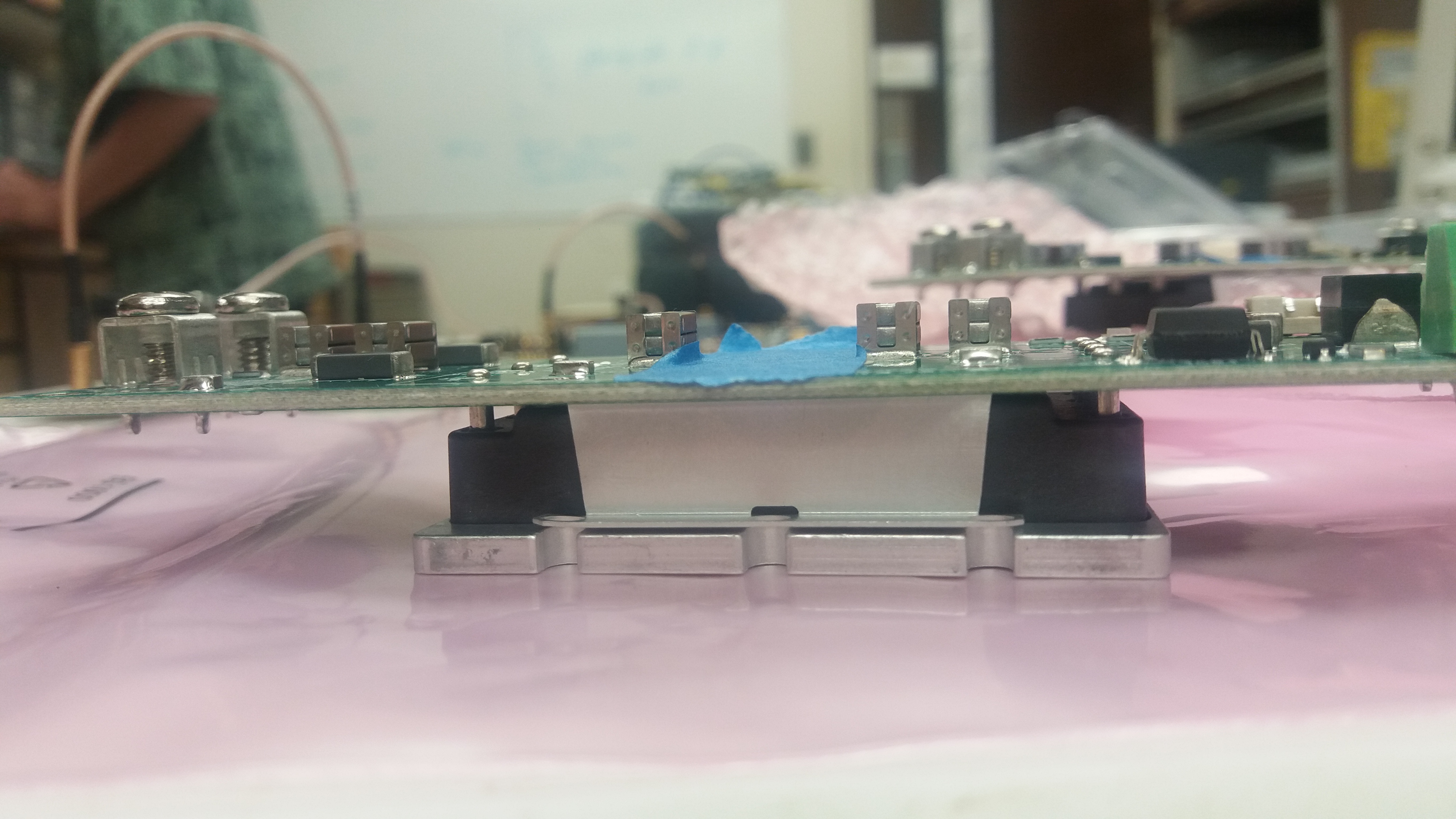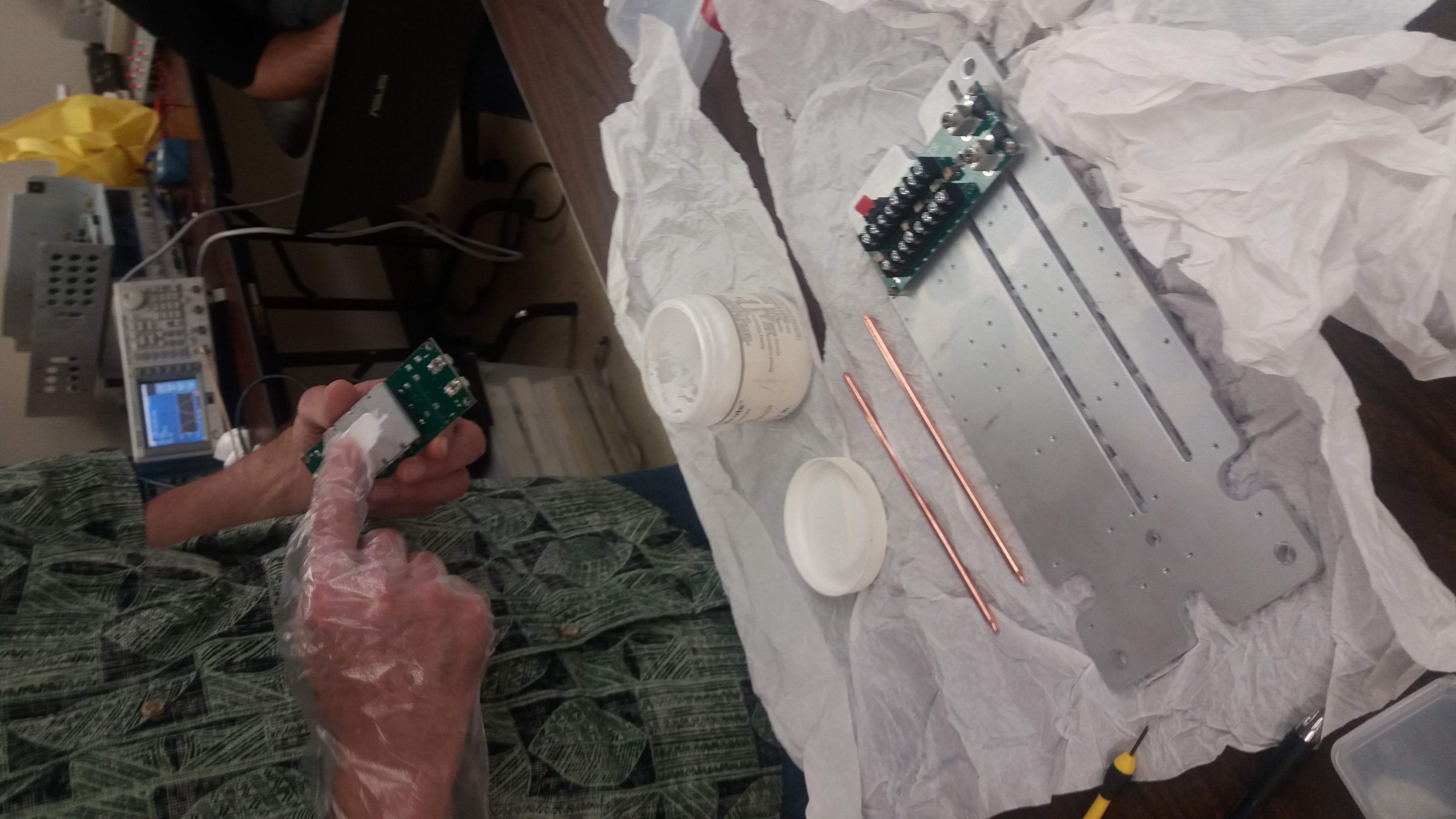 The plates are assembled on which the 8 crx cards will be placed. (Be careful with these plates because they can break if force is applied at certain points). The plates are going to be joined with 4 screws in the center and a glue (network) is applied so that they do not come loose (this will be placed at the end of the screw, the excess is removed). We must ensure that the two plates are even because above this anger the first plate with the antenna numbering (analog back plane) and it is important that they are even the bottom plates (preferably on a flat surface, it does not matter if the tabs are not at the same level, the important thing is that the top is at the same level. The first plate (analog black plane) is placed and on top of that the other plate is placed (LO back plane). To this plate we have to put the pins of the jumper, one is placed first and then others and on those the card will be soldered (circuit). The two plates are screwed to the base with 10 screws. Between the two plates are placed black spacers a single washer so that the connectors to the upper and lower plates are aligned. After installation, but thread lock onto the screws from underneath. Before putting the plate to the aluminum structure, you must check the length of the screws, so that they are not touching the bottom of the structure. At the end of the screw the glue (blue) is applied and excesses are cleaned. Note = the screws on the edge of the plate are shorter. Connect coaxial cables Before connecting the coaxial cables of the crx-8 plates to the antenna connectors, the liquid should be applied to clean connectors (contac lubricam) in order to avoid corroding (it should be applied a little more, avoid excesses) . It should also be put on the connectors where you can get noise like the scsi and the jumper. Power distribution supplies To have the complete plates of the vicor board the first thing that was done was to solder a resistance to the circuit and later a vicor module (v28c15c100bl) was incorporated in the lower part and the pins were soldered in the circuit, it is important that the welding cover the pin center and pass through the center of the pin to the bottom of the plate. The output of the plate must be 12.5 volts. (note = if we use 8 channels we will use 2 of these board and if we have 4 channels we use 1). Also, screw the little screws on the green connectors all the way in so they do not fall off. These circuits are put in turn in another base that is installed in the large structure (box), at the base of the vicor module a glue is applied and it is spread all over the base of this before putting it in the base, it is to ensure that the entrance of the vicor board that is being installed is on the correct side where it is going to connect with the input terminal board, in the holes where the vicor board is to be screwed, blue glue is applied. To install it is placed at the base of the vicor module on the other base and the base is moved a little to spread the pagemento but only a little. In the lower part of the base is applied glue and in the heat had (barilla) also before inserting in the orifices (if two plates are used also two heat pipes are used, care must be taken to install the correct side tuvos of heat). In the lower part of the plate glue is spread trying to cover where are the heat tuvos and part of the plate, also draw a square where the plate will go in the structure and also add glue. (NOTE = it is important that when the whole plate is installed in the structure it does not have the input card terminal because with the screw of the structure it does not fit well, so first the plate is placed in the structure and blue glue is applied to it. screw and then the input terminal card will be installed). You must clean excess glue. And they are going to put additional screws because the glue was coming out to the top of the plate. After everything is installed on the board, two cables will be connected per board between the vicor board and the input terminal board (if it has 8 channels, there will be 2 vicor board so 4 cables will be connected between the vicor board and the input terminal card). The black wire will always go in the row above (-) and the red in the row below (+), can be connected in any of the screws does not matter, except for the first one that corresponds to the ground in the input terminal, on the vicor board in the same way it is corroborated that the black wire is in the screw that says (-) and the red in which it says (+). On the other hand, at the output of the vicor board another 11 "cable is connected (make sure that black is on (-) and red on (+)) that goes to the power distribution. if you have 2 vicor plate there will be two cables that go to the power distribution plate, but if you have only one vicor in the same way you need the two cables, only in the vicor the two cables will be connected in the same place but in the power distribution anger connected as if we had two vicor plate). Antenna adapters (connector plate) The type M power connector (VHF connector) was installed in the lower right (for this the size of the hole had to be enlarged to 7.2 mm (confirm measurement)). To place the connector it put a nut, a guacha and an O-ring on the bottom (out) and on the top (in) a guacha and a nut. Later in the holes of the upper part we installed connectors type SMA to type N and in 3 holes of the lower left row (nut, guacha, plate in the upper part). to adjust kegs use 19 mm and 18 mm keys, so they are aligned. Note = if only 4 channels are used, black plugs are placed on the channels that are not going to be used. In the other two holes a gray plastic pressure plug was placed (it is placed towards the lower part (out)), before placing them with the deburring, the hole was softened and silicon (Heavy Duty silicone) was applied to lubricate them. Before installing the plate in the structure (box) apply blue glue in the screw holes (so that it doe
