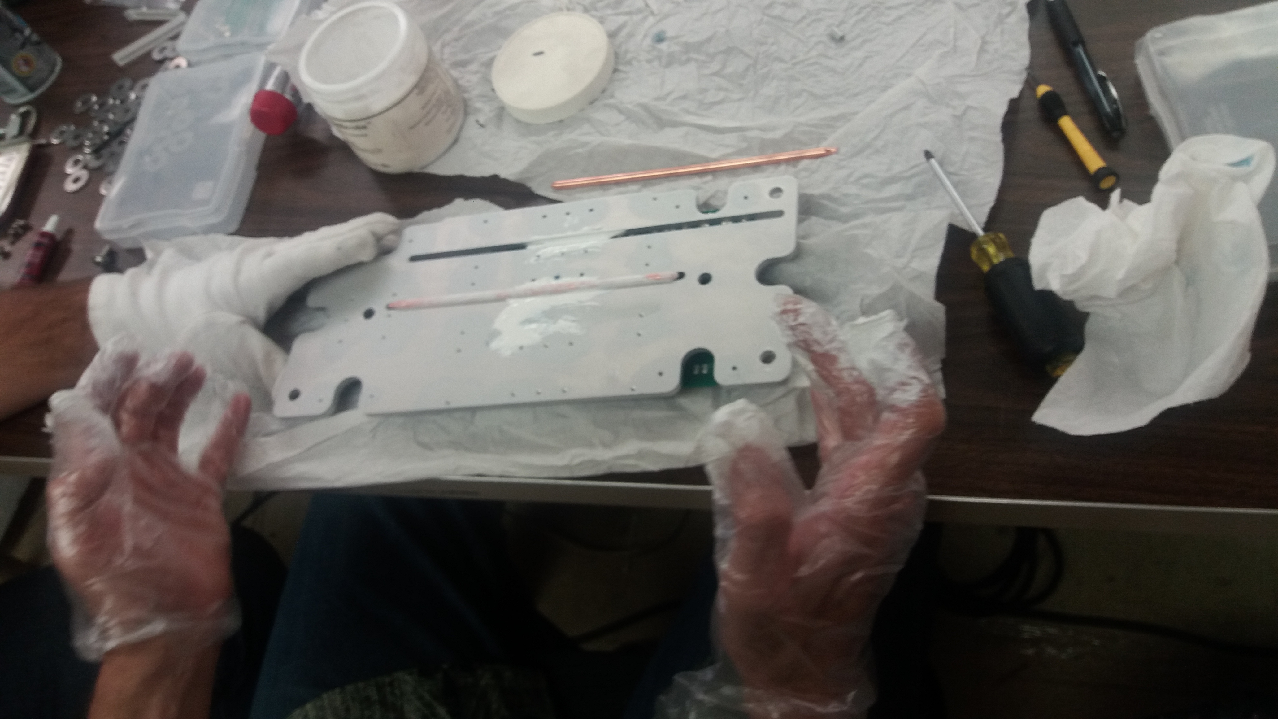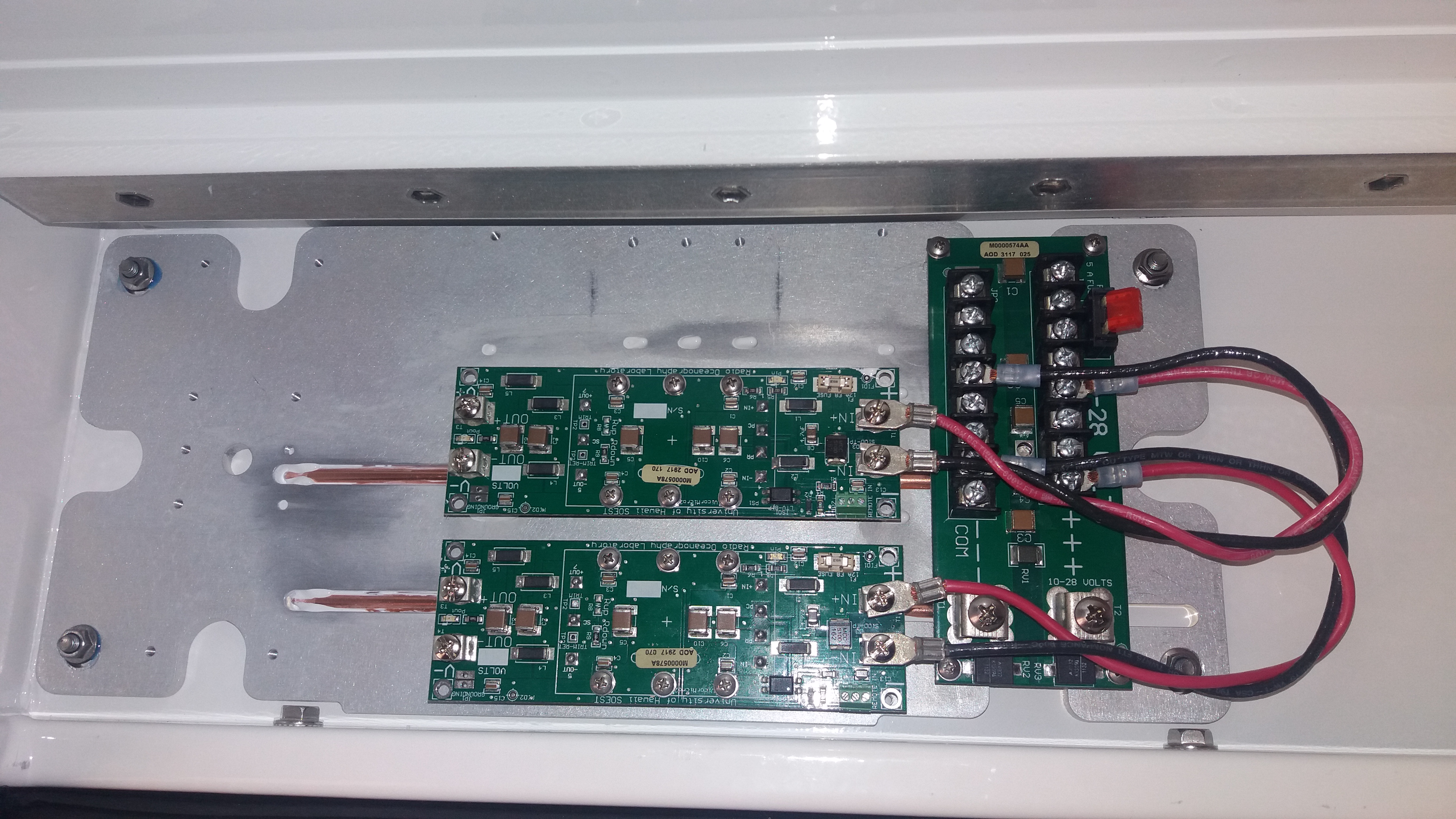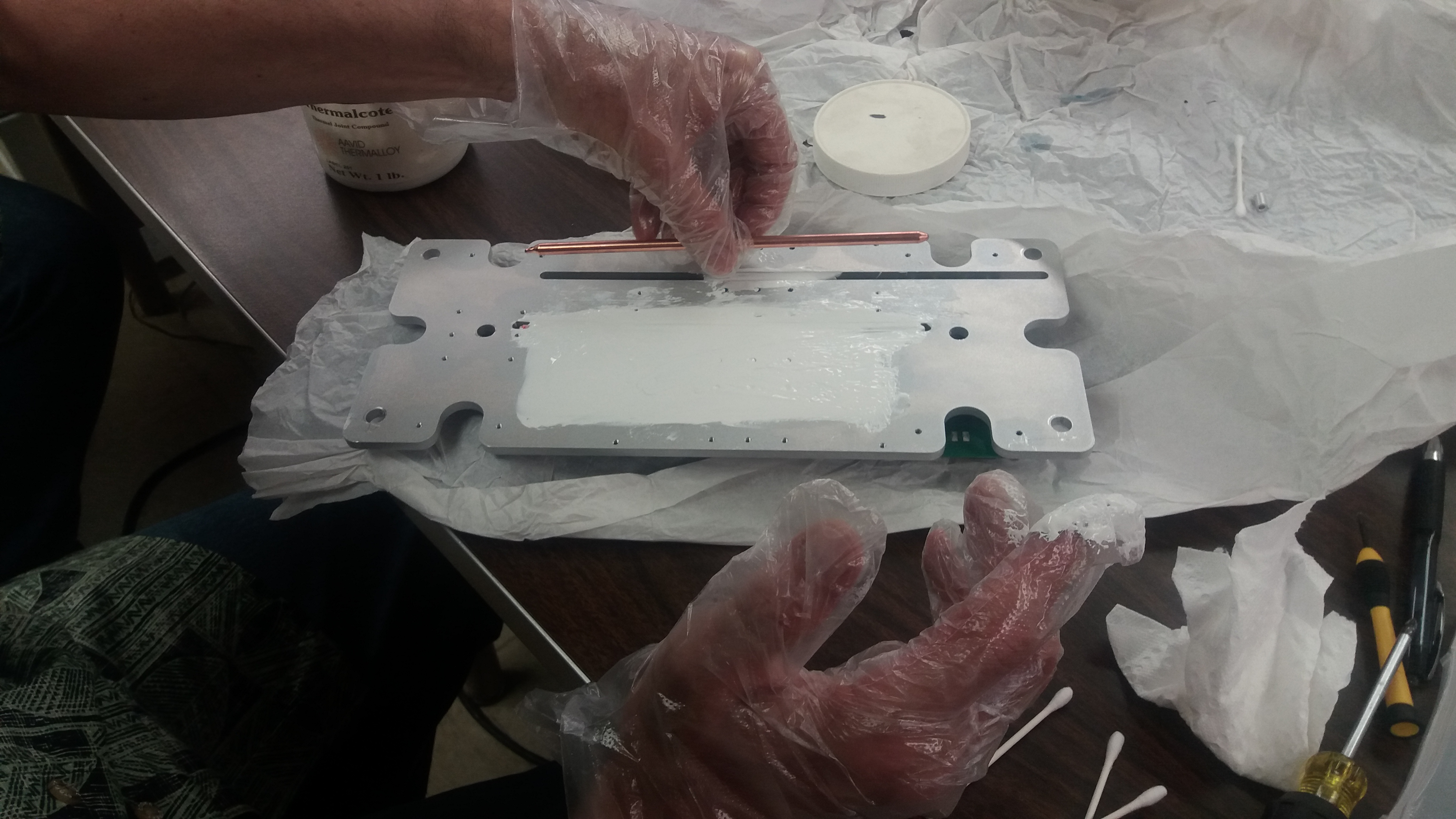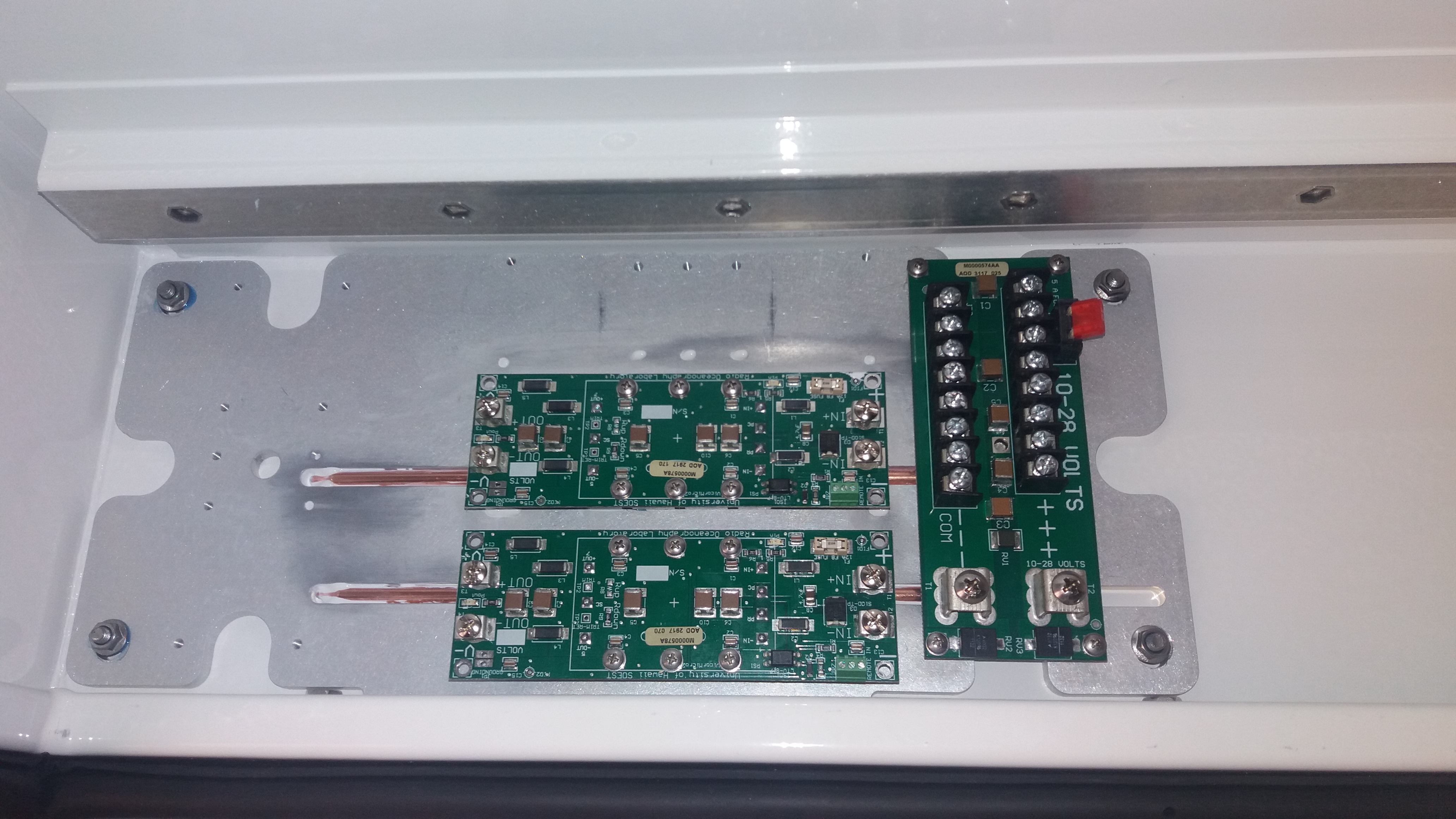 The plates are assembled on which the 8 crx cards will be placed. (Be careful with these plates because they can break if force is applied at certain points). The plates are going to be joined with 4 screws in the center and a glue (network) is applied so that they do not come loose (this will be placed at the end of the screw, the excess is removed). We must ensure that the two plates are even because above this anger the first plate with the antenna numbering (analog back plane) and it is important that they are even the bottom plates (preferably on a flat surface, it does not matter if the tabs are not at the same level, the important thing is that the top is at the same level. The first plate (analog black plane) is placed and on top of that the other plate is placed (LO back plane). To this plate we have to put the pins of the jumper, one is placed first and then others and on those the card will be soldered (circuit). The two plates are screwed to the base with 10 screws. Between the two plates are placed black spacers a single washer so that the connectors to the upper and lower plates are aligned. After installation, but thread lock onto the screws from underneath. Before putting the plate to the aluminum structure, you must check the length of the screws, so that they are not touching the bottom of the structure. At the end of the screw the glue (blue) is applied and excesses are cleaned. Note = the screws on the edge of the plate are shorter. Connect coaxial cables Before connecting the coaxial cables of the crx-8 plates to the antenna connectors, the liquid should be applied to clean connectors (contac lubricam) in order to avoid corroding (it should be applied a little more, avoid excesses) . It should also be put on the connectors where you can get noise like the scsi and the jumper. Power distribution supplies To have the complete plates of the vicor board the first thing that was done was to solder a resistance to the circuit and later a vicor module (v28c15c100bl) was incorporated in the lower part and the pins were soldered in the circuit, it is important that the welding cover the pin center and pass through the center of the pin to the bottom of the plate. The output of the plate must be 12.5 volts. (note = if we use 8 channels we will use 2 of these board and if we have 4 channels we use 1). Also, screw the little screws on the green connectors all the way in so they do not fall off. These circuits are put in turn in another base that is installed in the large structure (box), at the base of the vicor module a glue is applied and it is spread all over the base of this before putting it in the base, it is to ensure that the entrance of the vicor board that is being installed is on the correct side where it is going to connect with the input terminal board, in the holes where the vicor board is to be screwed, blue glue is applied. To install it is placed at the base of the vicor module on the other base and the base is moved a little to spread the pagemento but only a little. In the lower part of the base is applied glue and in the heat had (barilla) also before inserting in the orifices (if two plates are used also two heat pipes are used, care must be taken to install the correct side tuvos of heat). In the lower part of the plate glue is spread trying to cover where are the heat tuvos and part of the plate, also draw a square where the plate will go in the structure and also add glue. (NOTE = it is important that when the whole plate is installed in the structure it does not have the input card terminal because with the screw of the structure it does not fit well, so first the plate is placed in the structure and blue glue is applied to it. screw and then the input terminal card will be installed). You must clean excess glue. And they are going to put additional screws because the glue was coming out to the top of the plate. After everything is installed on the board, two cables will be connected per board between the vicor board and the input terminal board (if it has 8 channels, there will be 2 vicor board so 4 cables will be connected between the vicor board and the input terminal card). The black wire will always go in the row above (-) and the red in the row below (+), can be connected in any of the screws does not matter, except for the first one that corresponds to the ground in the input terminal, on the vicor board in the same way it is corroborated that the black wire is in the screw that says (-) and the red in which it says (+). On the other hand, at the output of the vicor board another 11 "cable is connected (make sure that black is on (-) and red on (+)) that goes to the power distribution. if you have 2 vicor plate there will be two cables that go to the power distribution plate, but if you have only one vicor in the same way you need the two cables, only in the vicor the two cables will be connected in the same place but in the power distribution anger connected as if we had two vicor plate). Antenna adapters (connector plate) The type M power connector (VHF connector) was installed in the lower right (for this the size of the hole had to be enlarged to 7.2 mm (confirm measurement)). To place the connector it put a nut, a guacha and an O-ring on the bottom (out) and on the top (in) a guacha and a nut. Later in the holes of the upper part we installed connectors type SMA to type N and in 3 holes of the lower left row (nut, guacha, plate in the upper part). to adjust kegs use 19 mm and 18 mm keys, so they are aligned. Note = if only 4 channels are used, black plugs are placed on the channels that are not going to be used. In the other two holes a gray plastic pressure plug was placed (it is placed towards the lower part (out)), before placing them with the deburring, the hole was softened and silicon (Heavy Duty silicone) was applied to lubricate them. Before installing the plate in the structure (box) apply blue glue in the screw holes (so that it doe